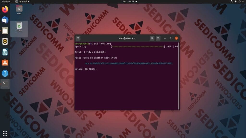 Допустим, нам нужно отправить файл lynis.log с хоста ubuntu на узел Sedicomm . Для этого на компьютере ubuntu выполним следующую команду: