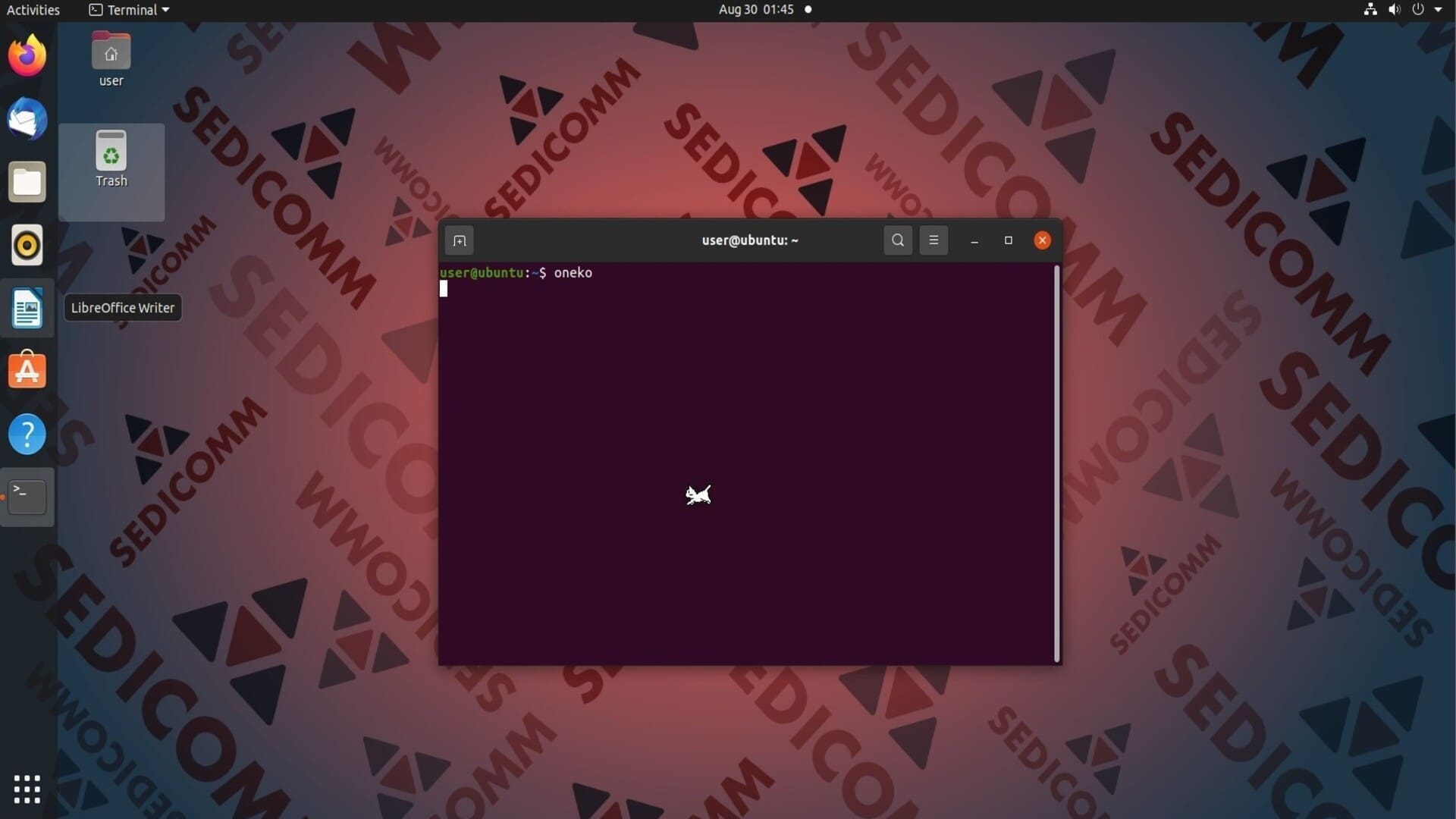 Команда oneko создает на экране компьютера анимированного кота, который постоянно пытается догнать курсор мыши. Например: