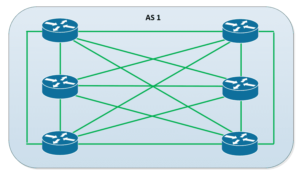 Представлена сеть из 6 маршрутизаторов iBGP. Используя формулу full mesh N(N-1)/2, где N — это количество маршрутизаторов, можно рассчитать количество смежностей между одноранговыми узлами (соседями) iBGP: