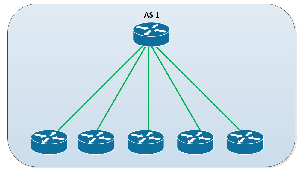 Количество маршрутизаторов не изменилось, но теперь у каждого маршрутизатора есть по одному соединению iBGP с «маршрутизатором-отражателем». Когда один из маршрутизаторов объявляет сеть маршрутизатору-отражателю, она будет объявлена для всех других маршрутизаторов iBGP.