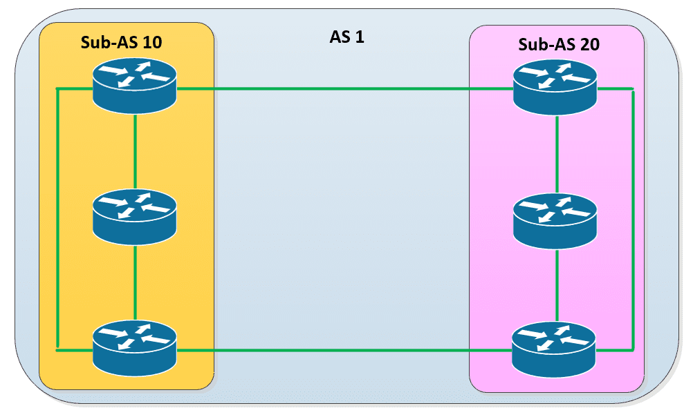В рамках sub-AS всё ещё требуется iBGP с full mesh. Между sub-AS настройка происходит так же, как и в eBGP. За переделами сети номера sub-AS не видны, виден только основной номер AS. Часто можно заметить, что для sub-AS используются частные номера AS (64512 — 65535), но также можно выбрать любой другой номер.