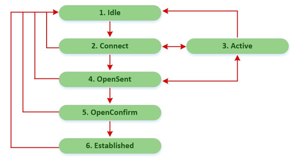 Ниже представлены 6 состояний соседства (neighbor adjacency), в которых может оказаться маршрутизатор BGP при попытке установить смежность с другим маршрутизатором: