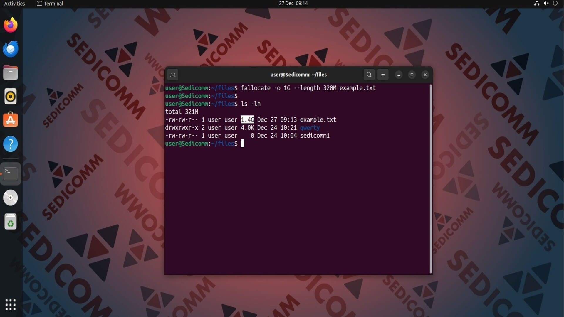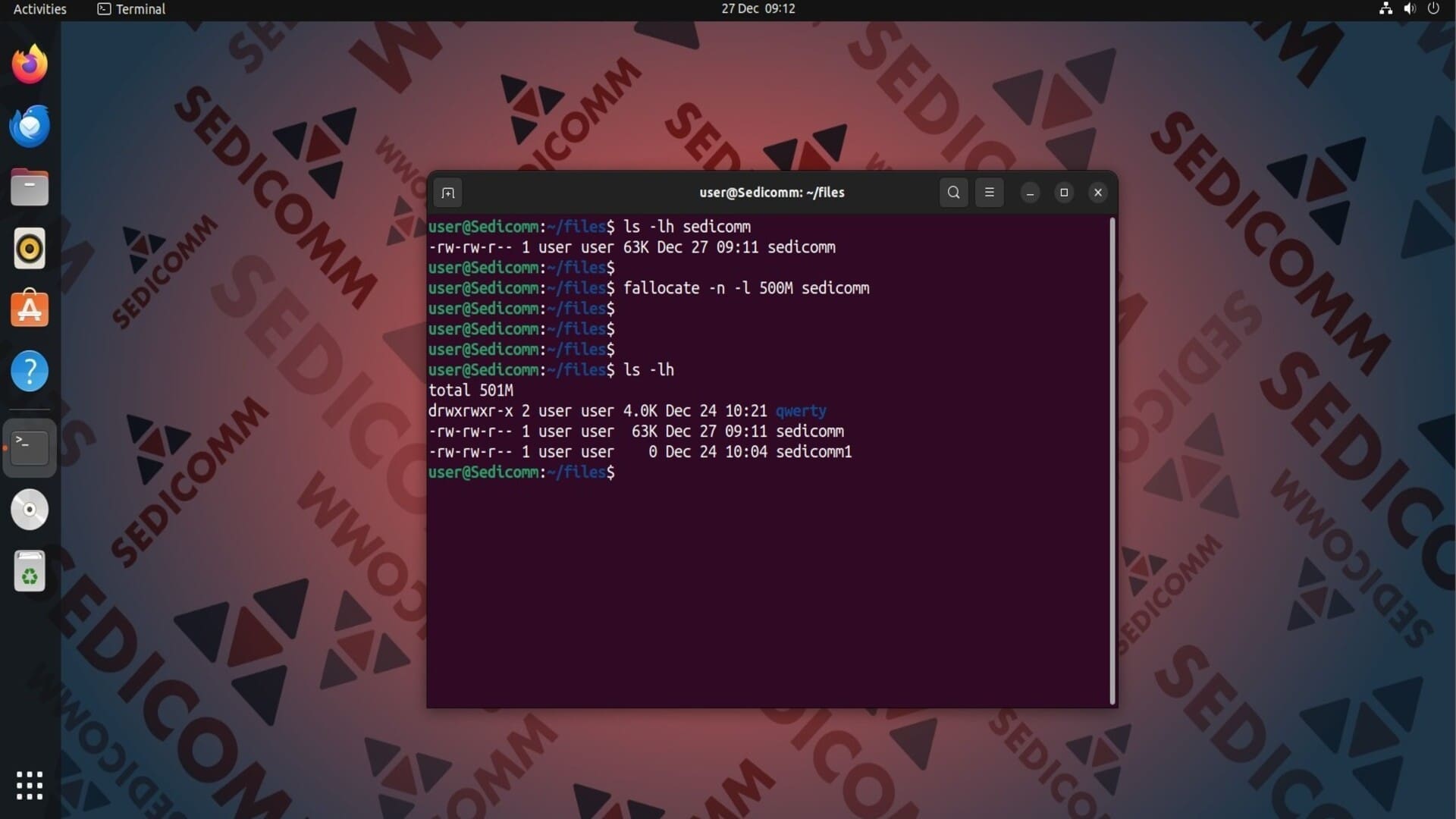 Например, у нас в каталоге есть файл sedicomm, размер которого — 63 килобайта. Дополнительно выделим для него 500 мегабайт дискового пространства: