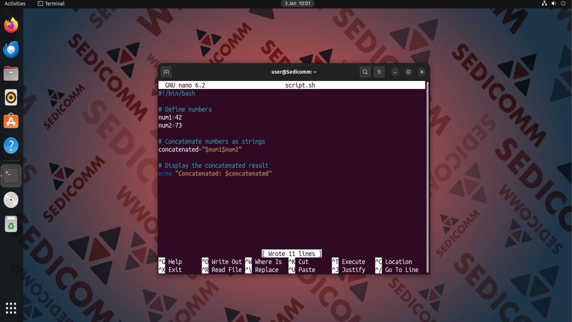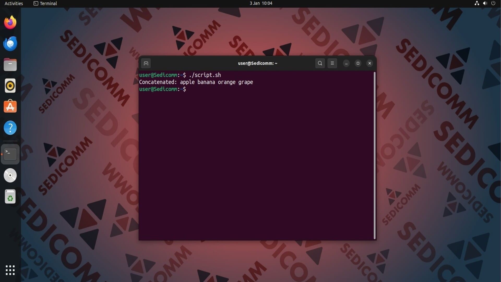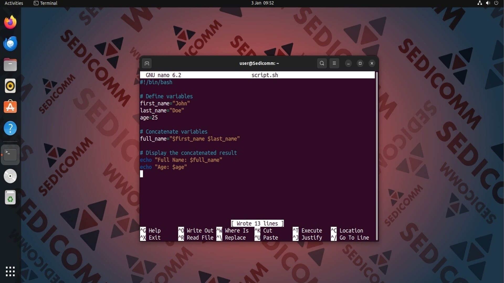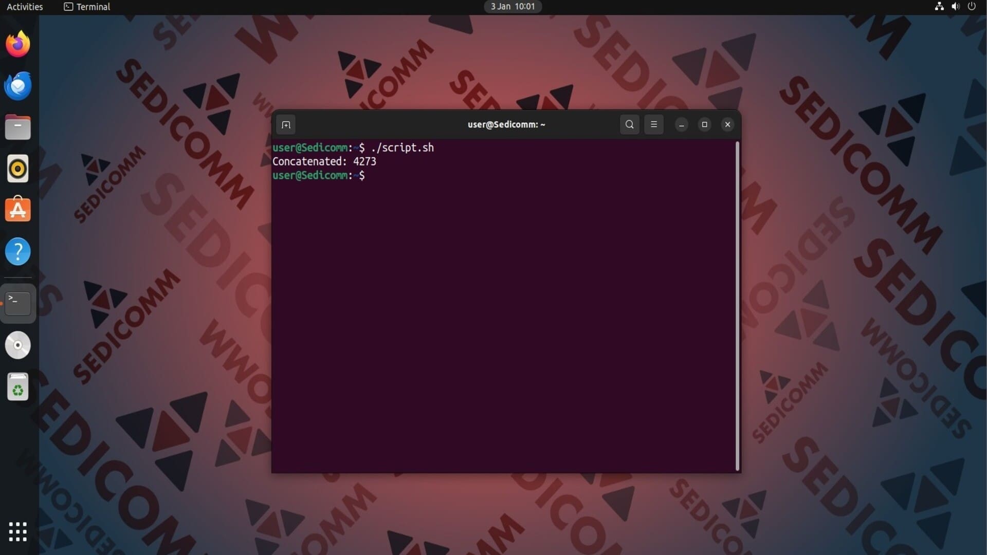 В скриптах Bash реализован механизм объединения строк и чисел. Допустим, у нас есть имя и фамилия человека (строчный тип данных), и его возраст (числовой тип данных), и нам нужно вывести эти значения на экран. Для этого напишем сценарий, который выполнит такие действия: