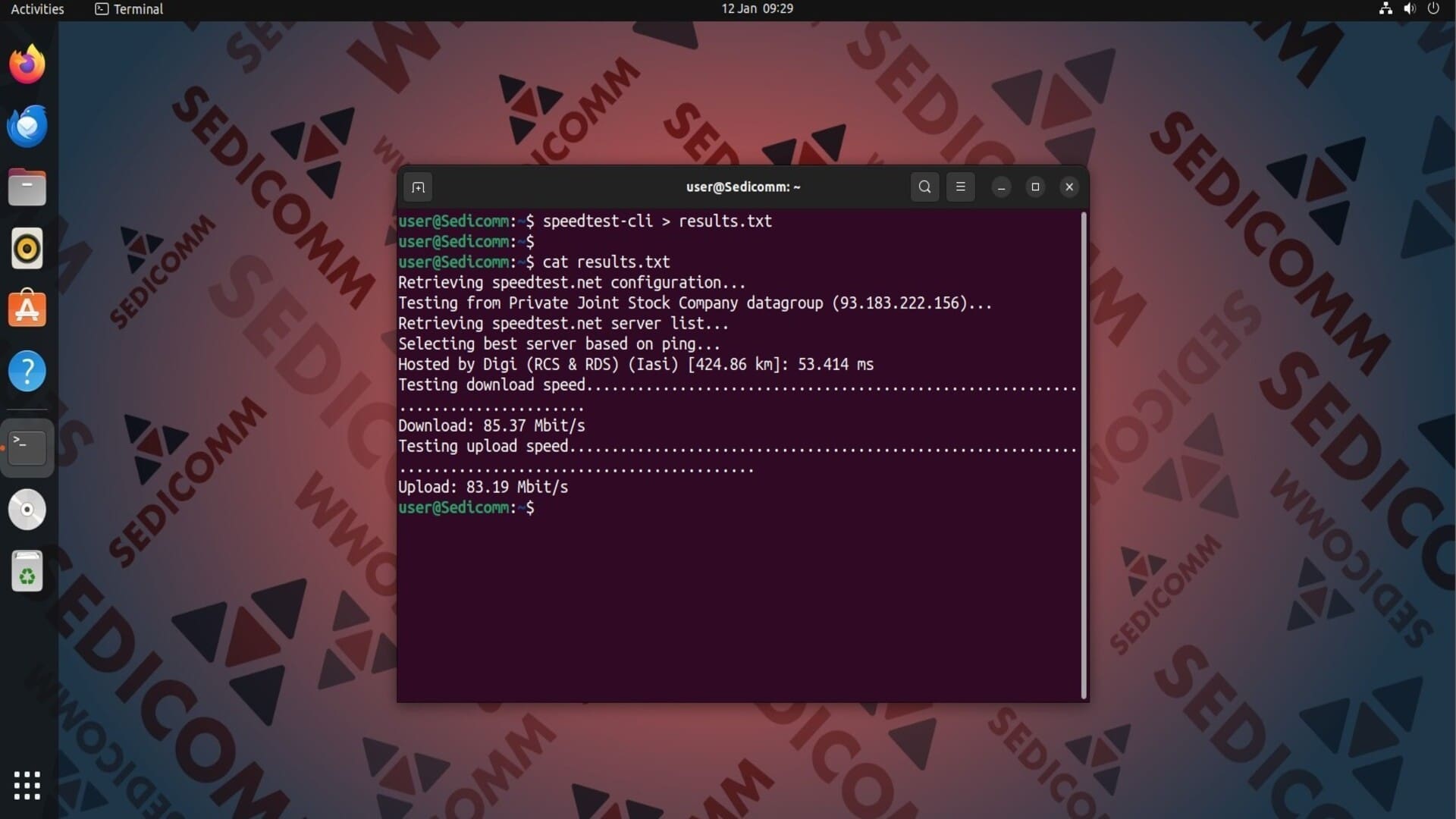 Записывать скорость Интернета в файл полезно для последующего ее анализа. К примеру, направим вывод команды speedtest-cli в файл results.txt: