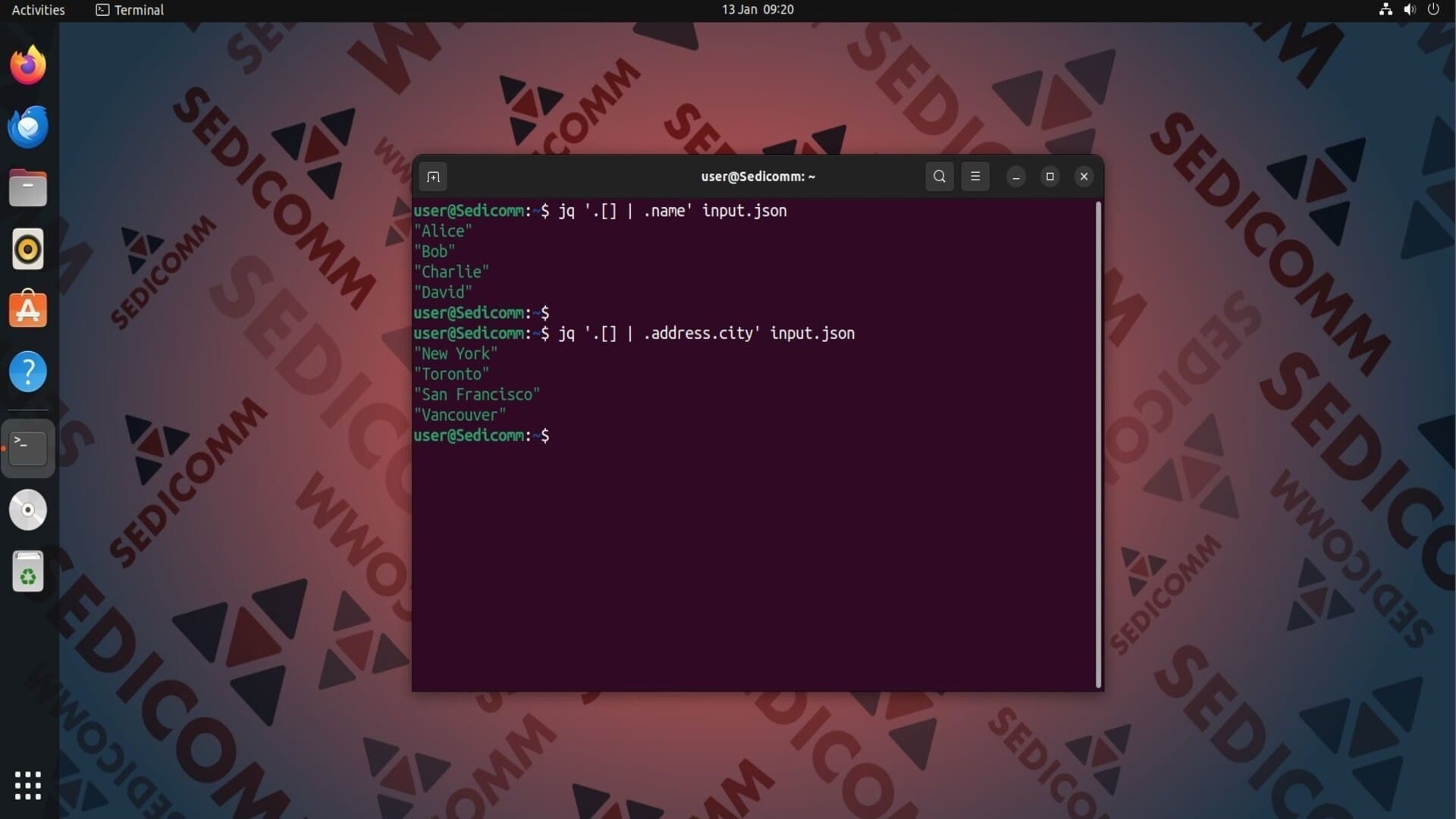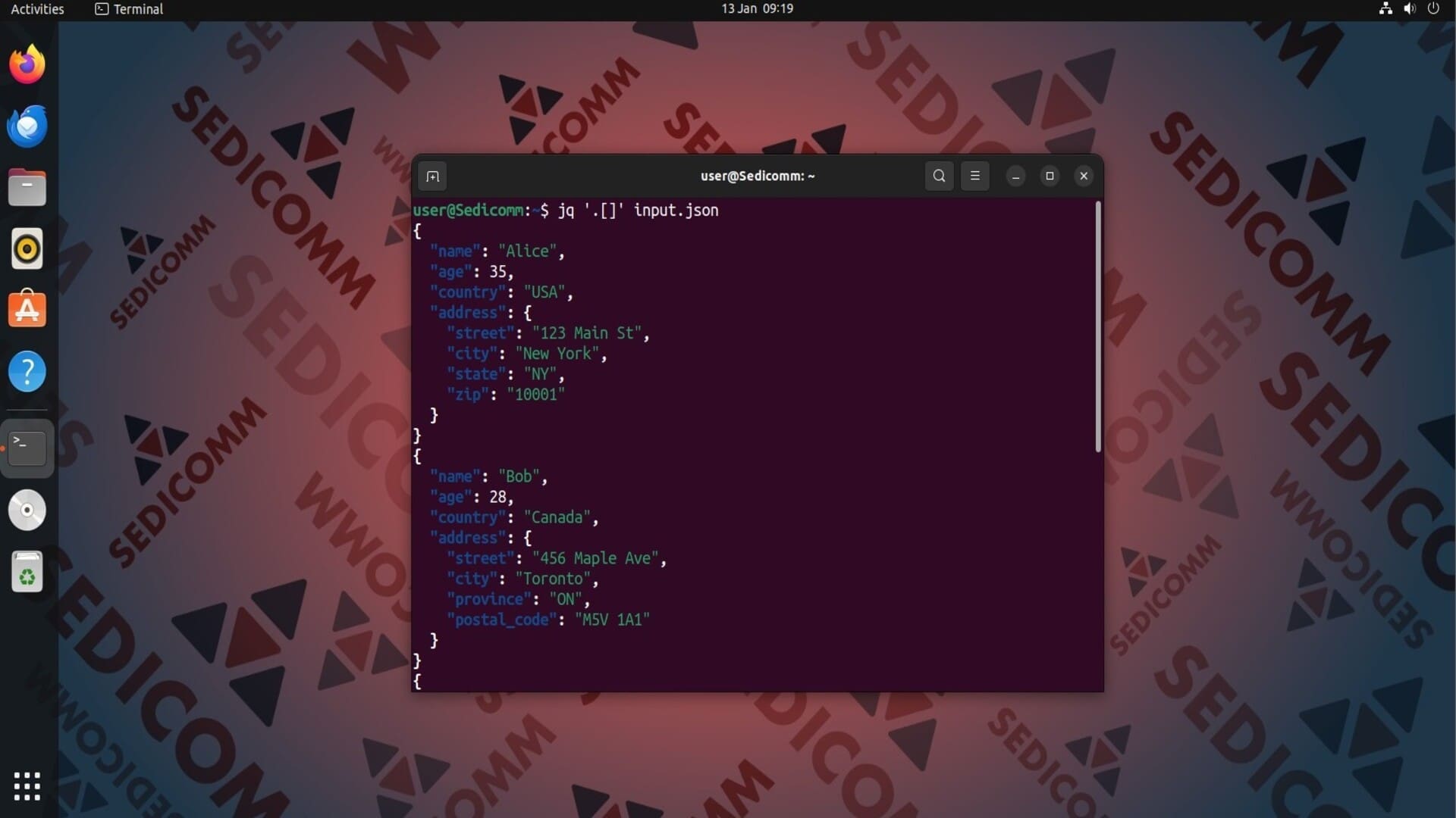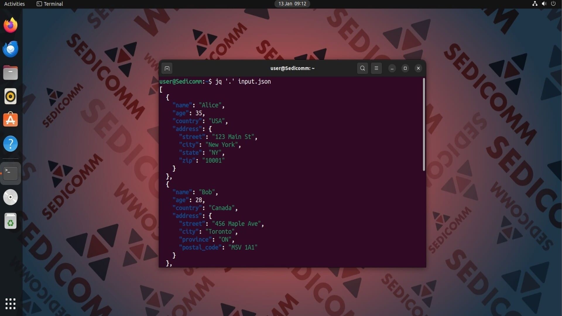 С помощью утилиты jq можно вывести на экран все данные из файла в формате JSON. Для этого следует использовать команду: