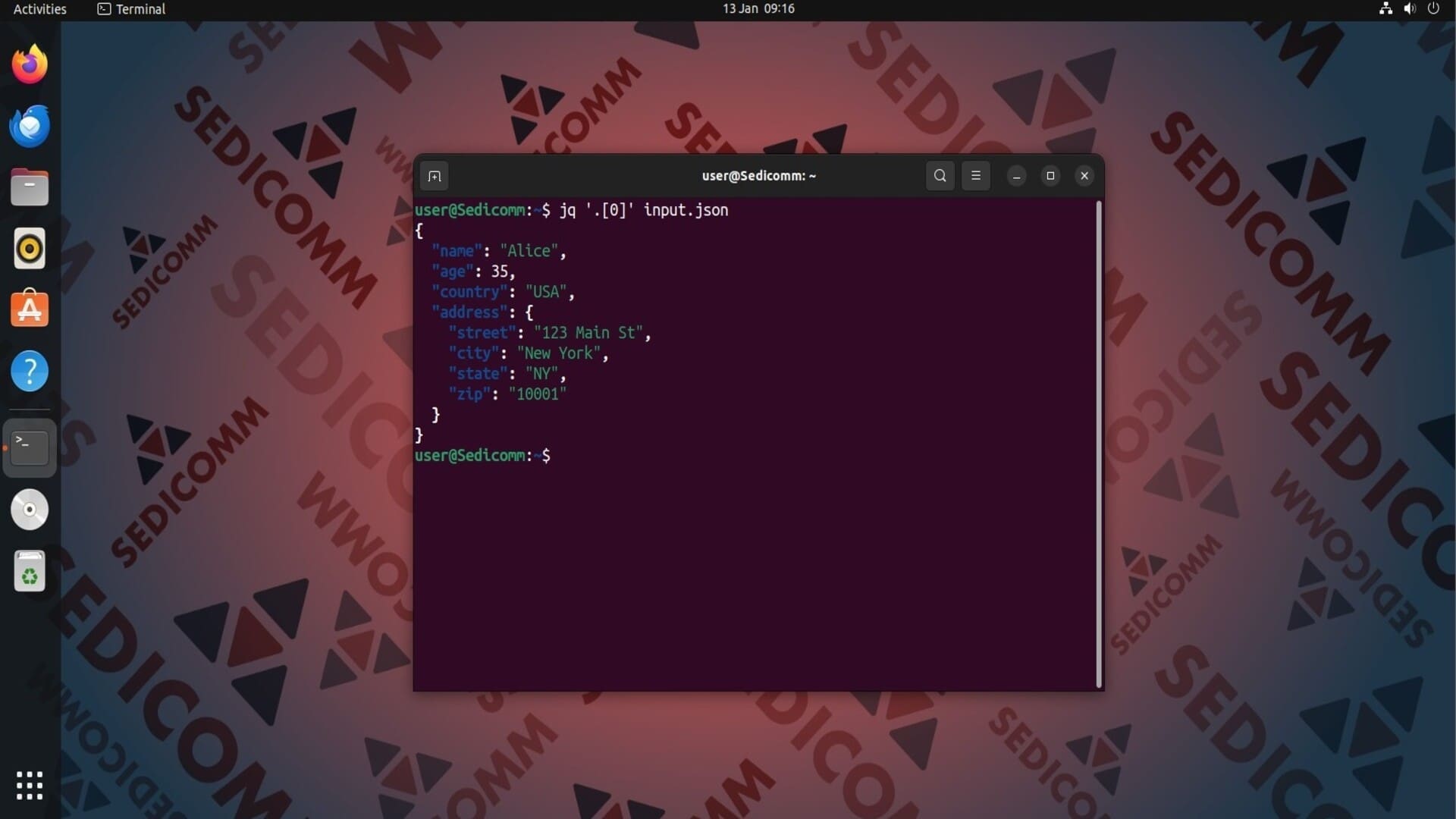 У каждого объекта в файле формата JSON есть свой индекс. Первый объект имеет индекс 0, второй — 1, третий — 2 и так далее. Чтобы отобразить в терминале объект с индексом 0, выполните команду: