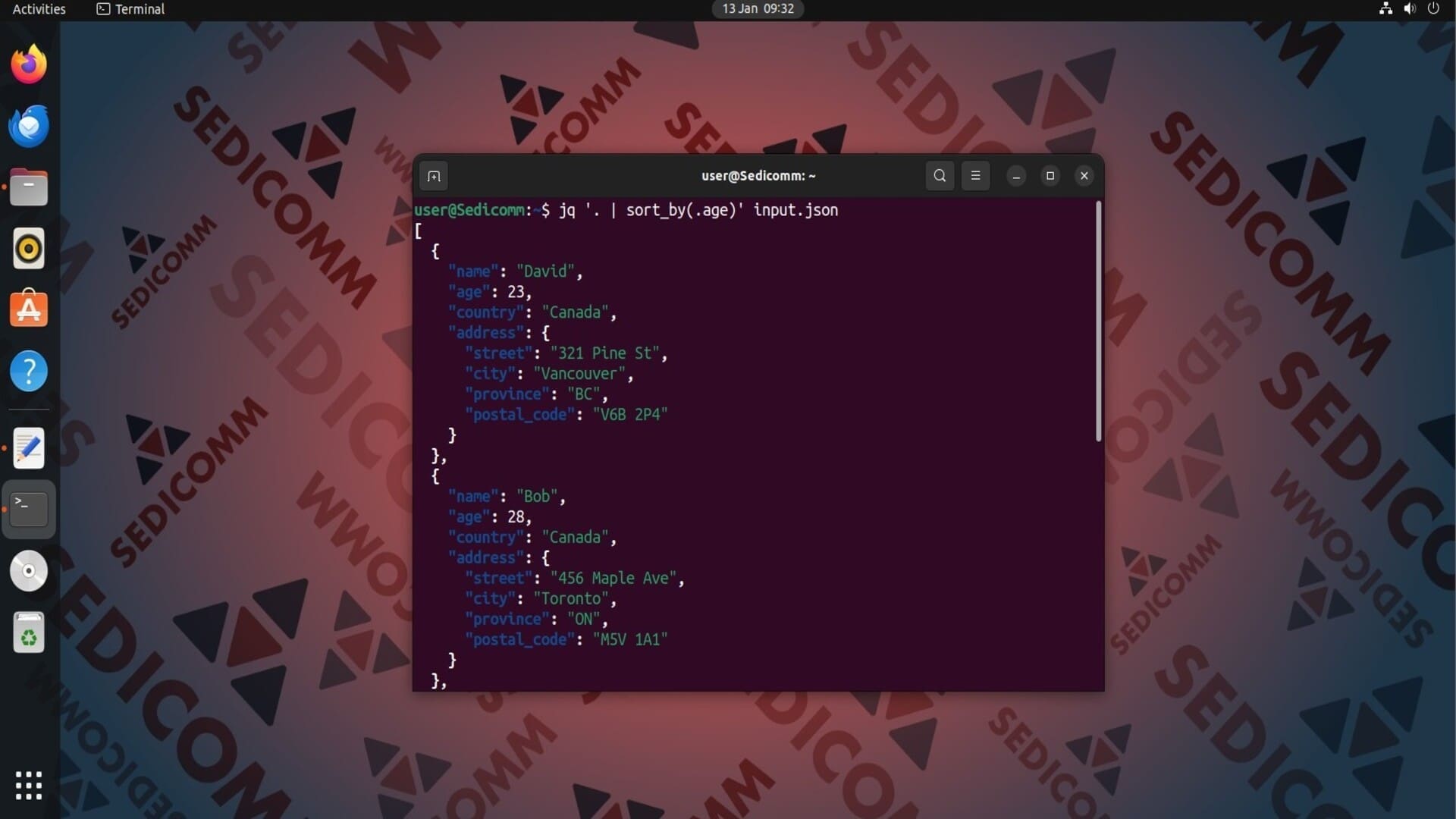 Утилита jq имеет встроенную функцию sort_by, которая позволяет сортировать объекты массива по значениям ключей. К примеру, отсортируем input.json по значениям age: