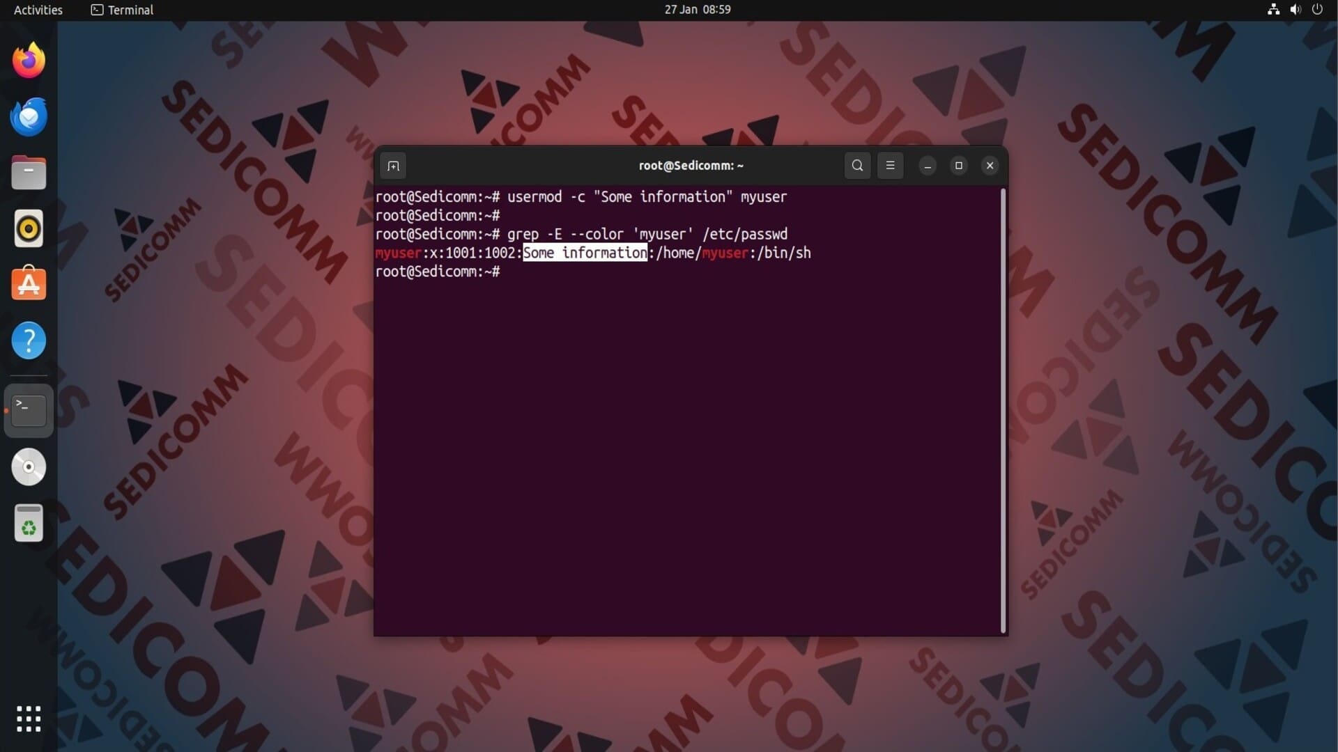 Функционал ОС Linux позволяет Вам написать описание для учетной записи пользователя. Эти комментарии обычно используются для предоставления дополнительной информации о пользователе. Чтобы создать описание для учетной записи, используйте команду usermod с опцией -c (в качестве аргумента которой укажите желаемое описание) и именем пользователя. Например: