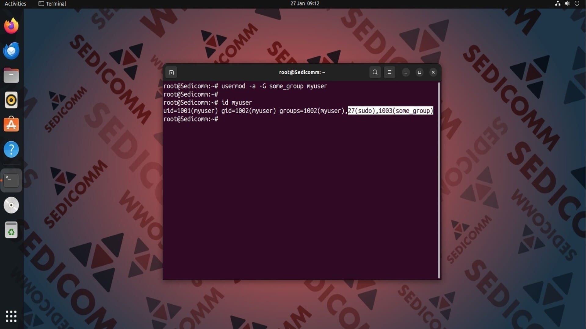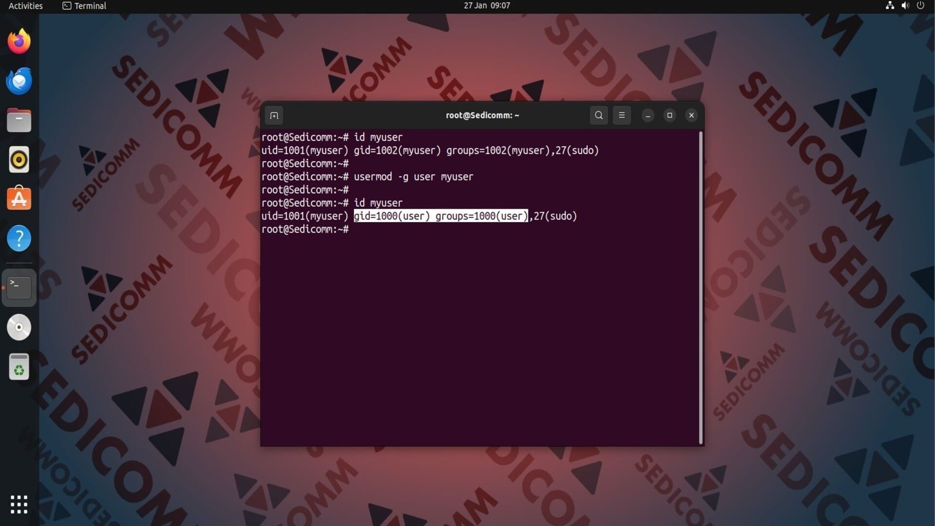 На скриншоте выше видно, что значения gid и groups изменились после выполнения предыдущей команды.