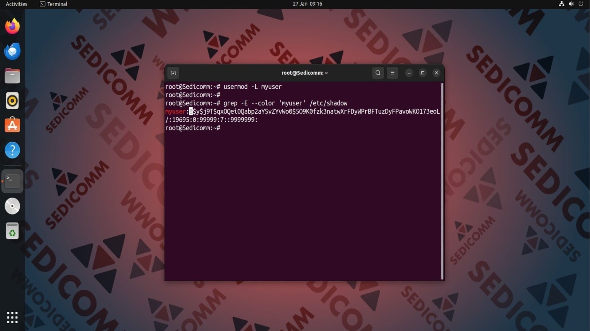 Вы можете убедиться в том, что заблокировали учетную запись. Для этого в файле /etc/shadow найдите строку с именем нужного пользователя. В начале поля, в котором находится зашифрованный пароль, будет стоять восклицательный знак (!). Это означает, что данный пользователь не может выполнять вход в ОС: