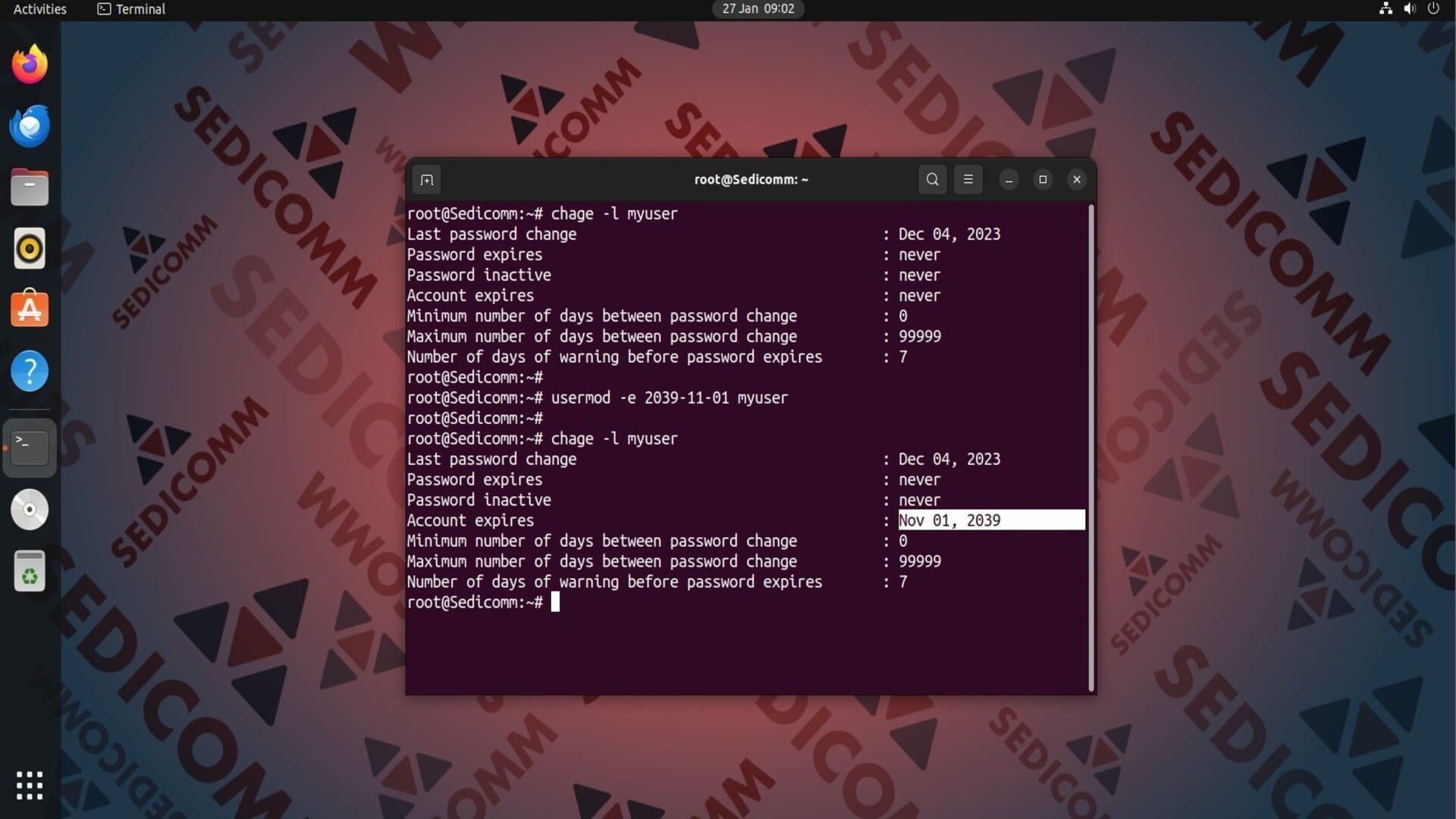Учетные записи пользователей в Linux могут иметь срок действия, но по умолчанию он не установлен. Из-за чего аккаунт пользователя доступен для использования неограниченное количество времени. Чтобы узнать дату истечения срока действия учетной записи, примените команду chage с опцией -l и именем пользователя: