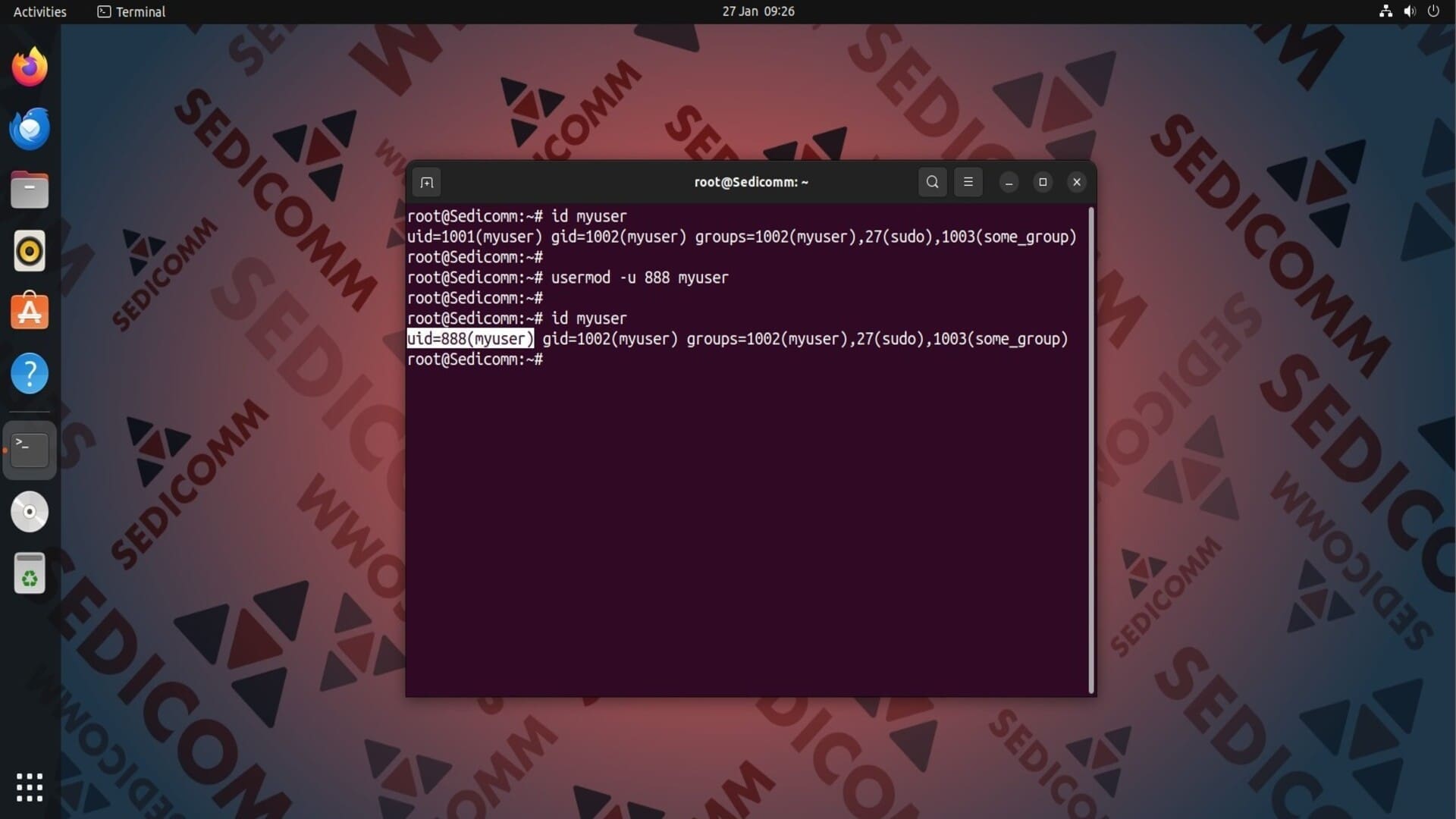 Идентификатор пользователя (UID) — уникальный цифровой номер, присваиваемый каждой учетной записи пользователя. По умолчанию он автоматически назначается при создании нового аккаунта. Однако, Вы все равно можете его изменить. Чтобы это сделать, используйте команду usermod с опцией -u и незанятым идентификатором в качестве аргумента. Например: