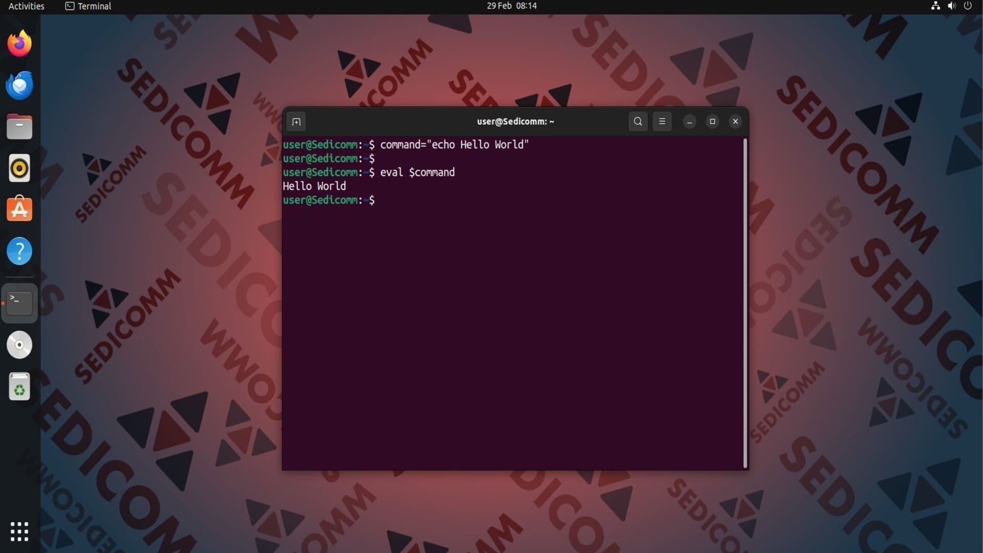 Попробуем записать в переменную command значение echo Hello World. После чего передадим ее в качестве аргумента eval: