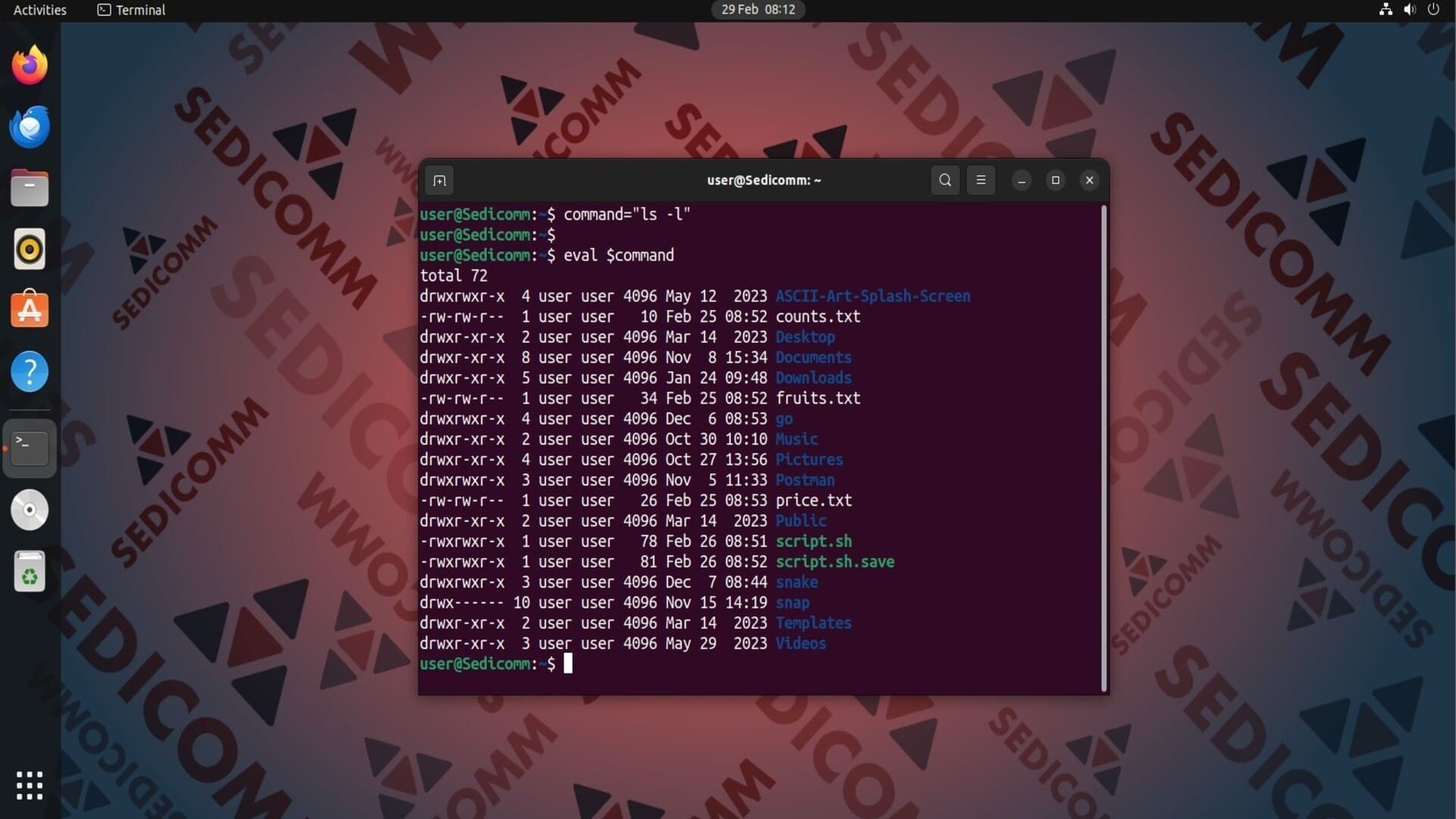 Команда ls -l выводит на экран содержимое текущего каталога в длинном формате. Теперь давайте передадим переменную command в качестве аргумента eval: