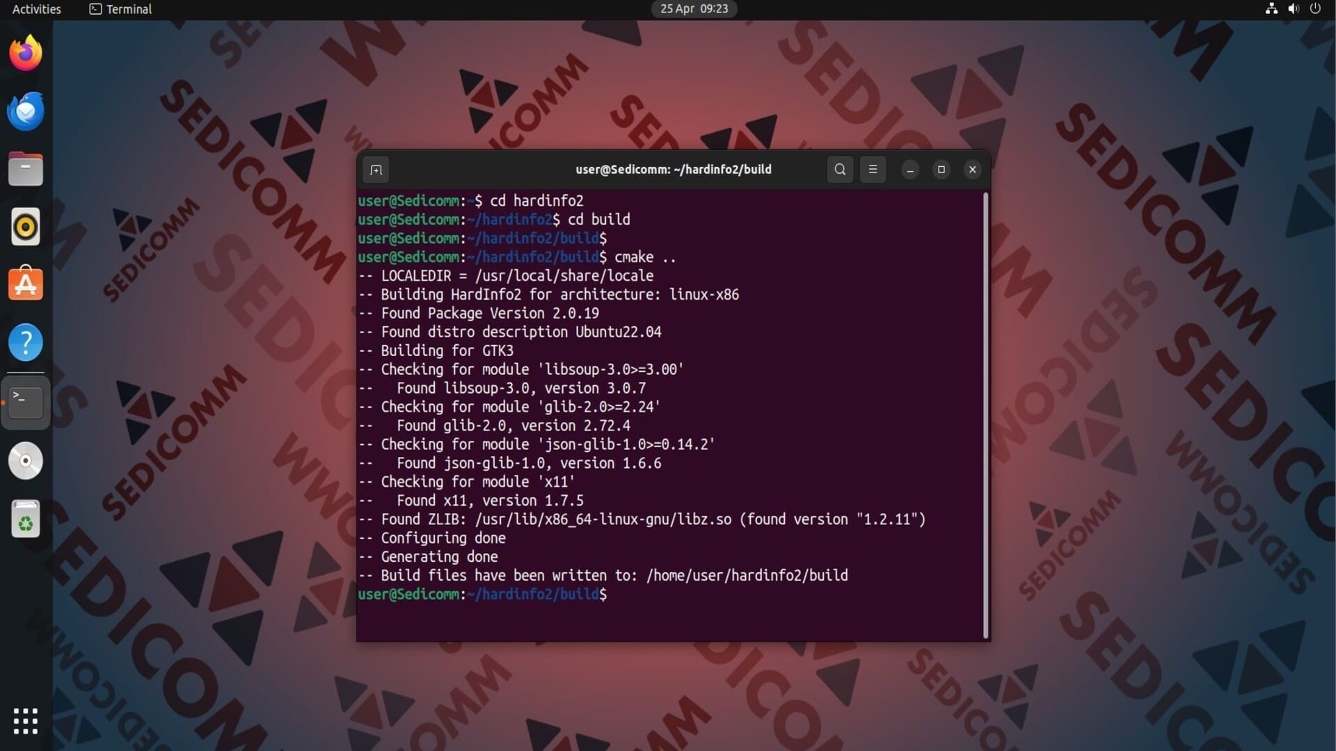 Затем создайте директорию build и перейдите в нее. После чего, начните процесс сборки приложения Hardinfo2 с помощью cmake: