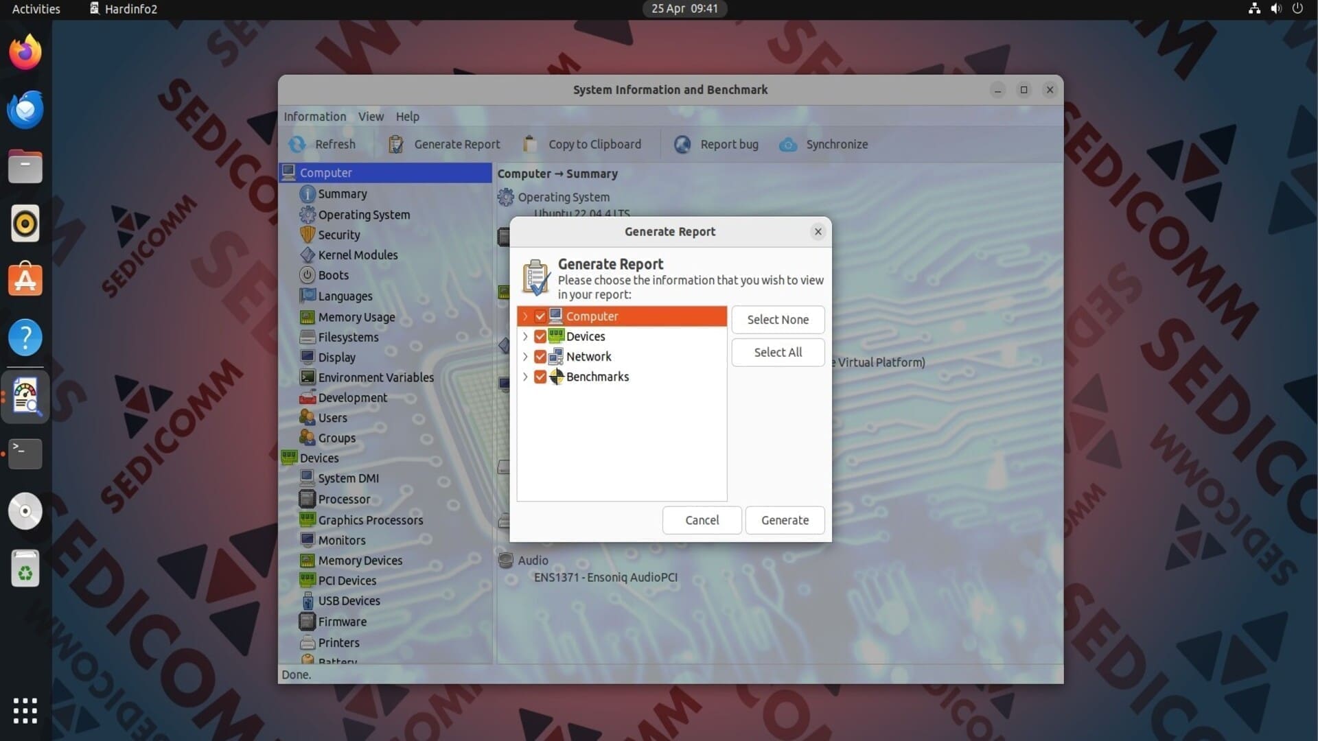 Одной из главных особенностей Hardinfo2 является наличие функции генерации отчетов. Чтобы создать отчет, нажмите на кнопку Generate Report. В открывшемся окне выберите, какие данные нужно в него включить, и нажмите Generate.