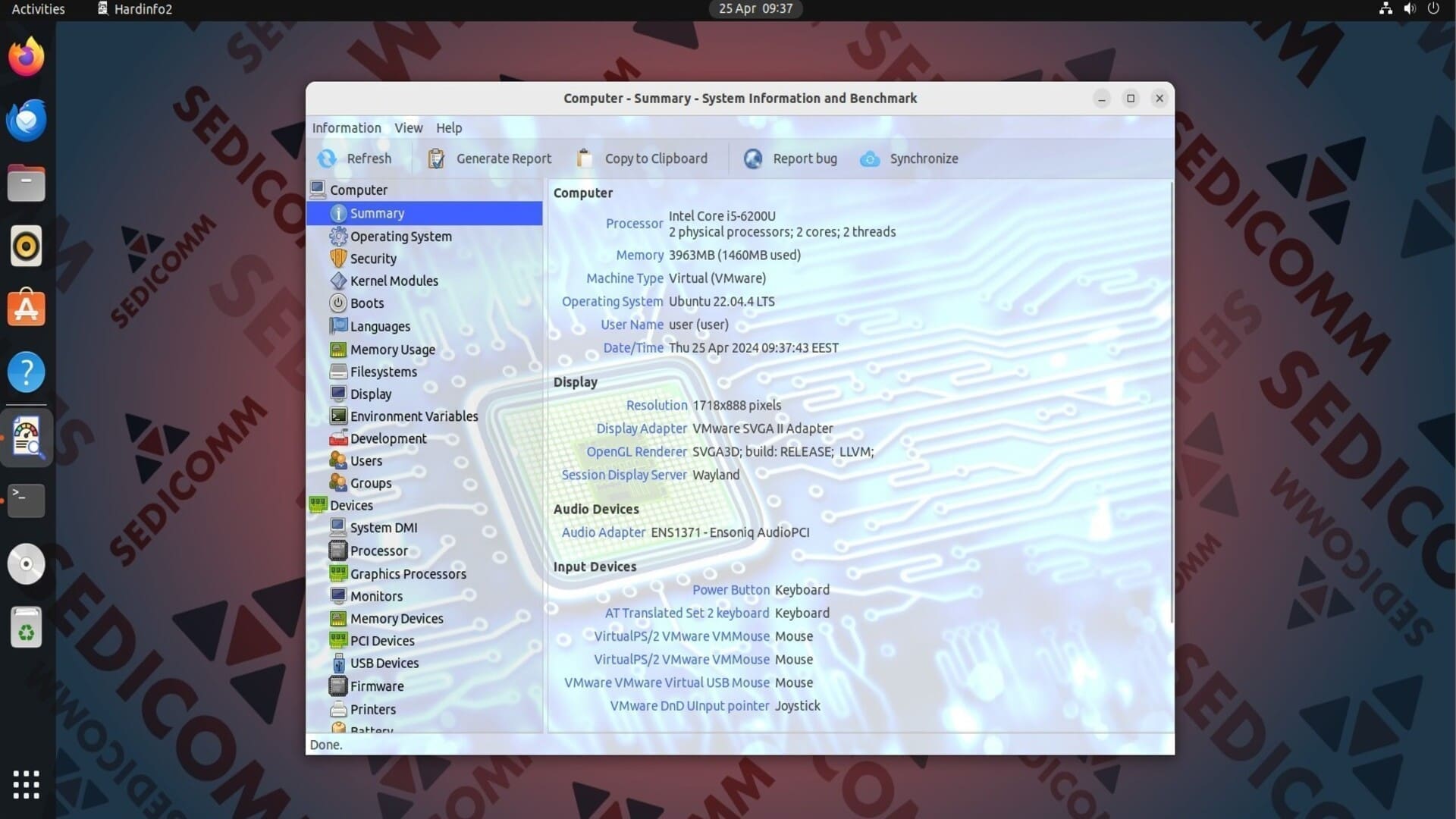 lm-sensors— позволяет отслеживать значения аппаратных датчиков;sysbench— предоставляет набор синтетических бенчмарков для оценки различных параметров производительности ЦП, ОЗУ и так далее;lsscsi— предоставляет подробную информацию об устройствах SCSI;mesa-utils— содержит набор инструментов для управления и устранения неполадок Mesa, открытой реализации OpenGL, Vulkan и других графических API;dmidecode— собирает информацию о BIOS, материнской плате, модулях памяти, ЦП и так далее;udisks2— используется для управления устройствами хранения данных и томами жестких дисков;xdg-utils— предоставляет набор утилит для управления интеграцией рабочего стола;iperf3— позволяет измерять нагрузку на сеть.