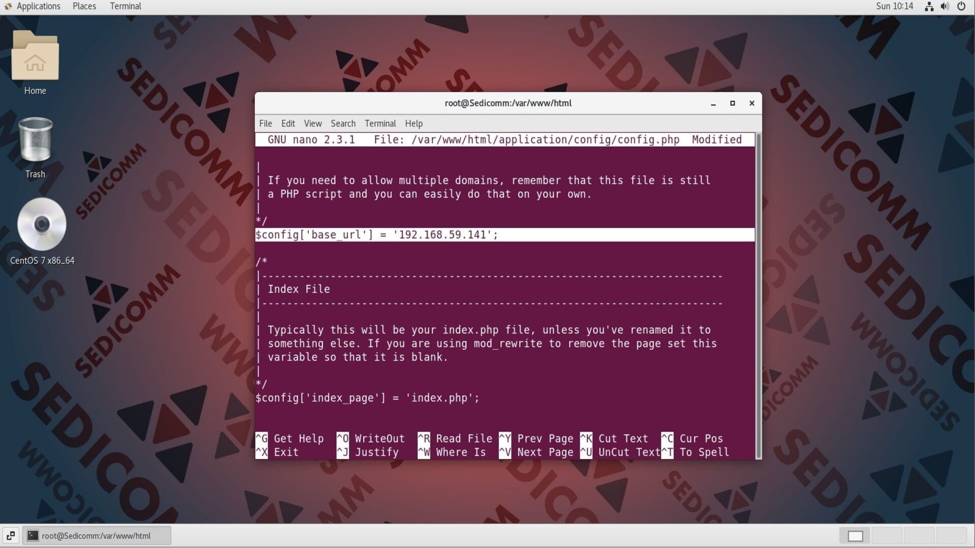 Далее Вам потребуется настроить базовый URL-адрес для CodeIgniter. Чтобы это сделать, откройте файл /var/www/html/application/config/config.php в любом текстовом редакторе (например, nano) и задайте нужное значение для параметра $config['base_url'].