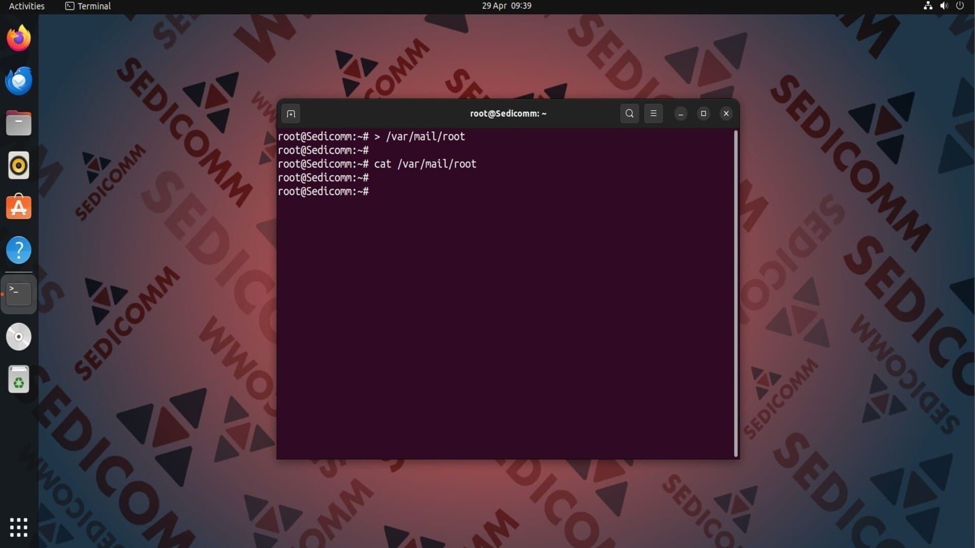 Чтобы каждый раз не очищать почтовый файл вручную, Вы можете настроить задание cron, которое будет выполнять эту операцию автоматически в заданное время. Например, нам нужно удалять содержимое файла /var/mail/root каждый день в полночь. Для этого выполним в терминале следующую команду:
