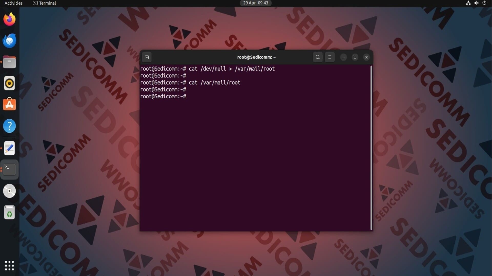 Перед тем, как удалить содержимое файла почты, авторизуйтесь в учетной записи root с помощью команды su -. Первый способ очистки содержимого такого файла, который мы рассмотрим — перенаправление в него из оболочки null (несуществующего объекта). Таким образом мы, по сути, перезаписываем содержимое файла пустотой (ничем):