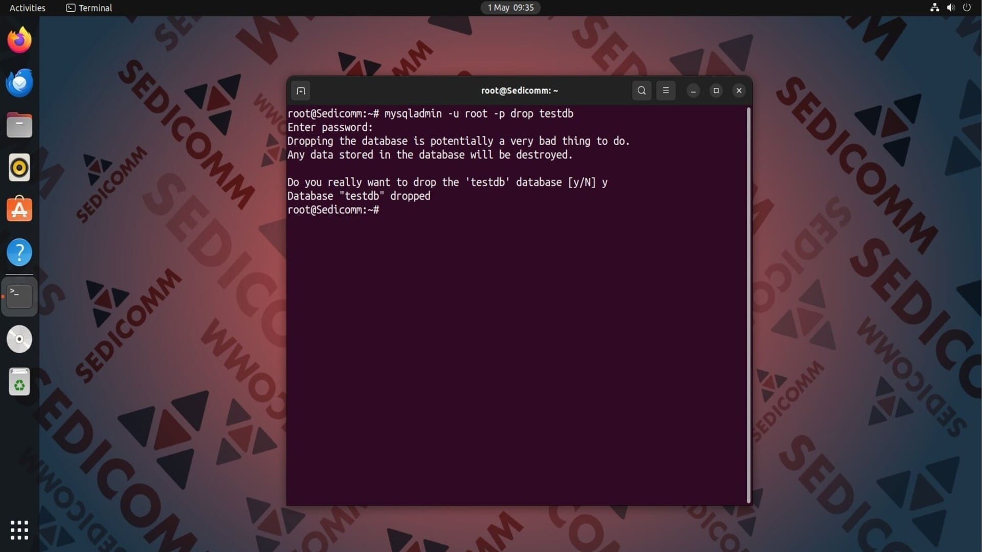 Если Вам нужно удалить какую-либо базу данных MySQL, воспользуйтесь подкомандой drop с названием базы данных в качестве аргумента. Например: