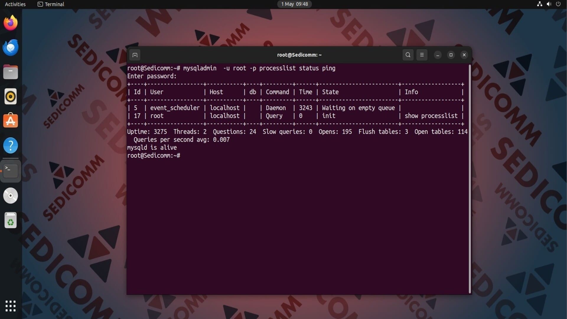 Инструмент mysqladmin может выполнять сразу несколько подкоманд. Для примера одновременно воспользуемся командами processlist, status и ping: