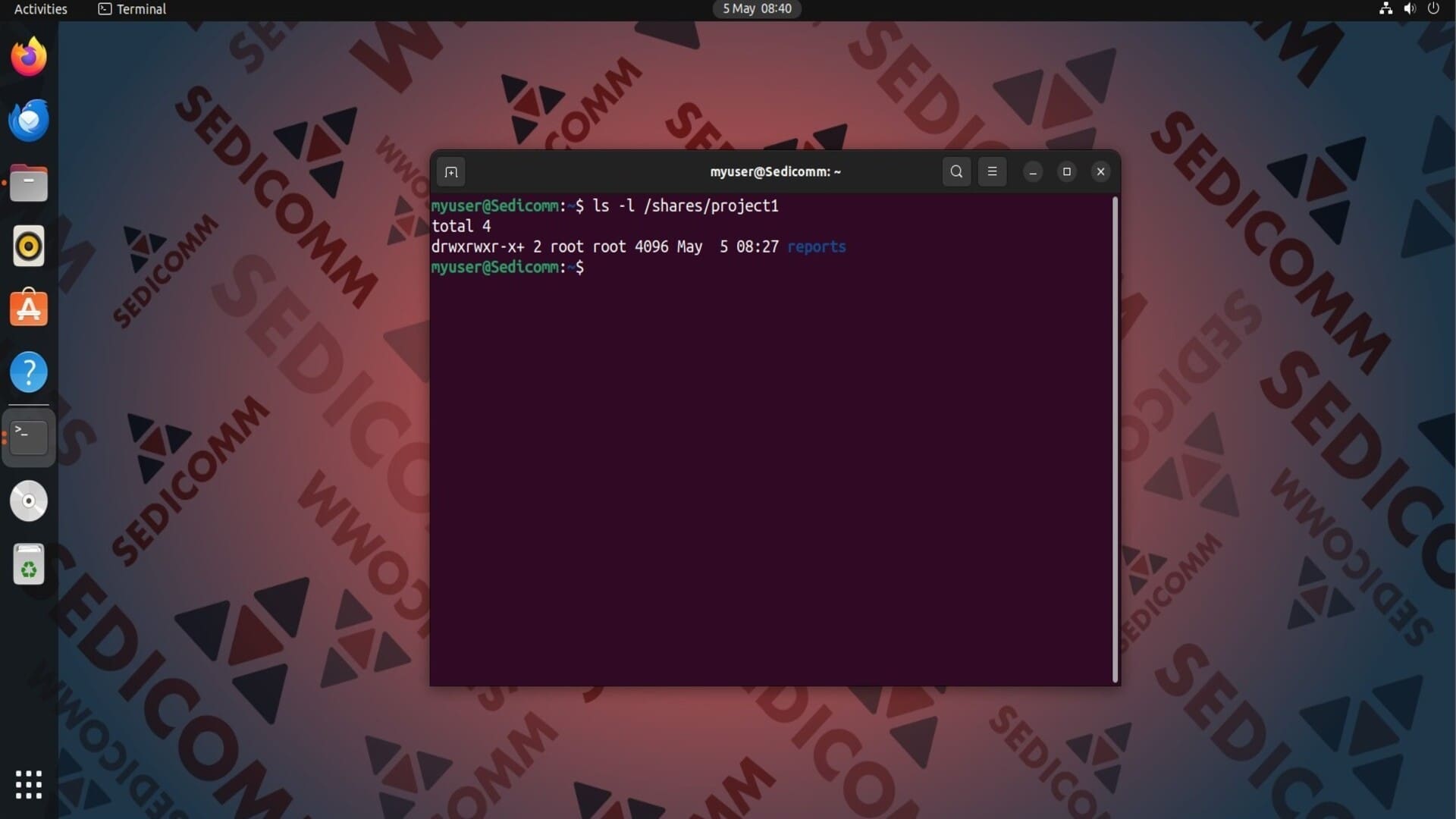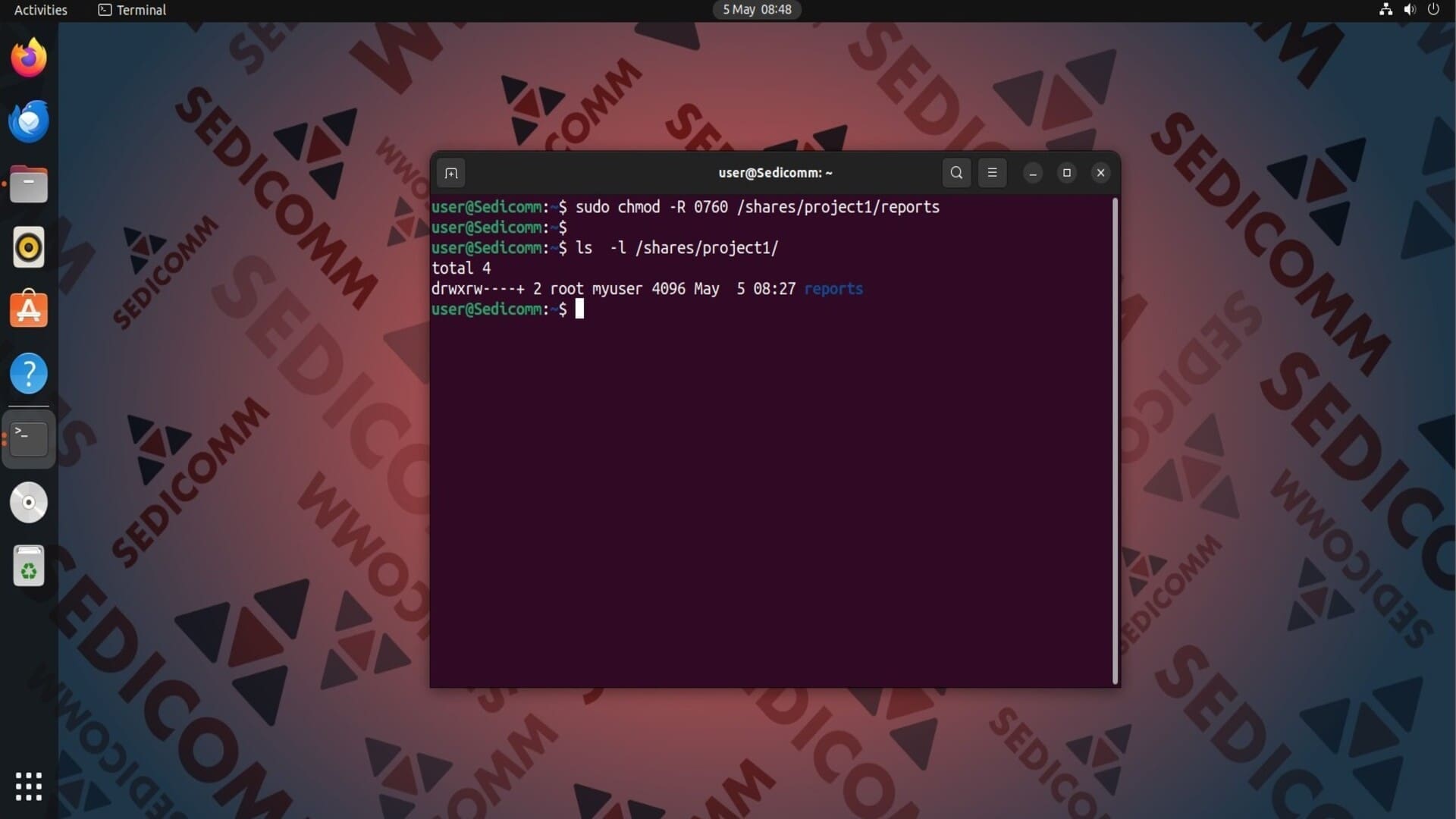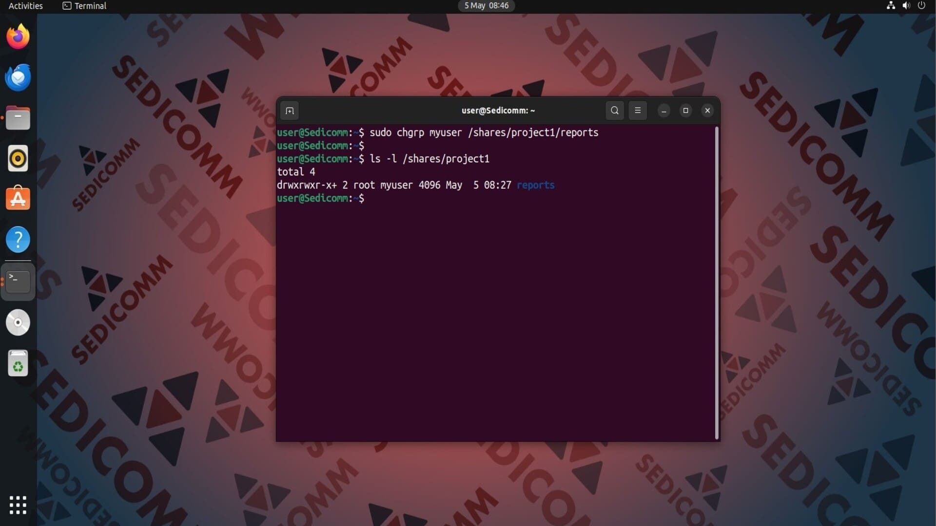 Чтобы назначить определенные права доступа группе пользователей, сначала установите эту группу в качестве владельца файла. Для этого используйте команду chgrp. К примеру, сделаем группу myuser владельцем каталога /shares/project1/reports: