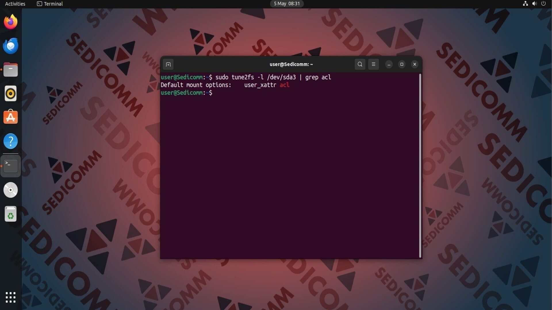 Также Вам нужно узнать, использует ли файловая система списки контроля доступа к файлам. Для этого выполните в терминале: