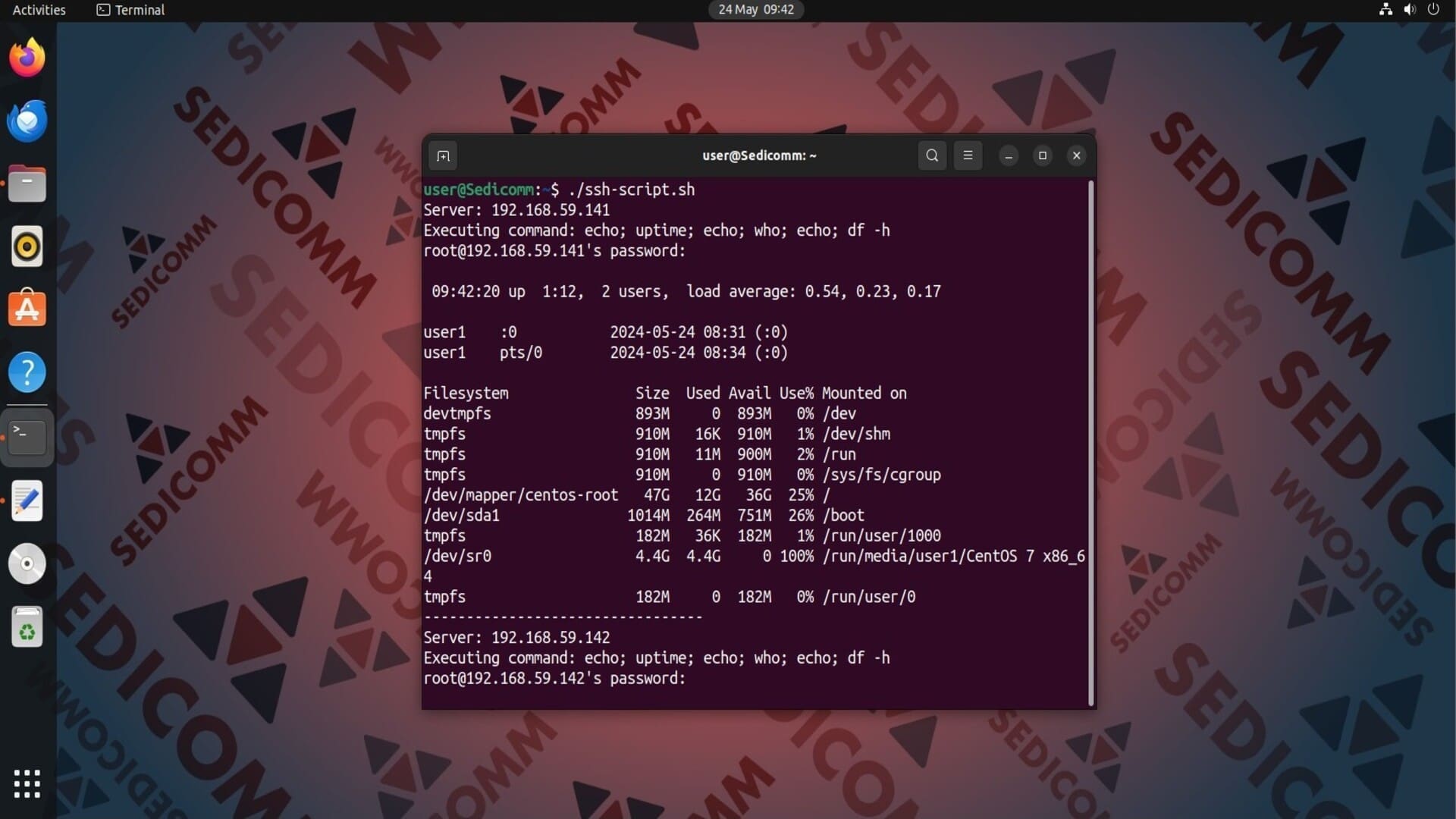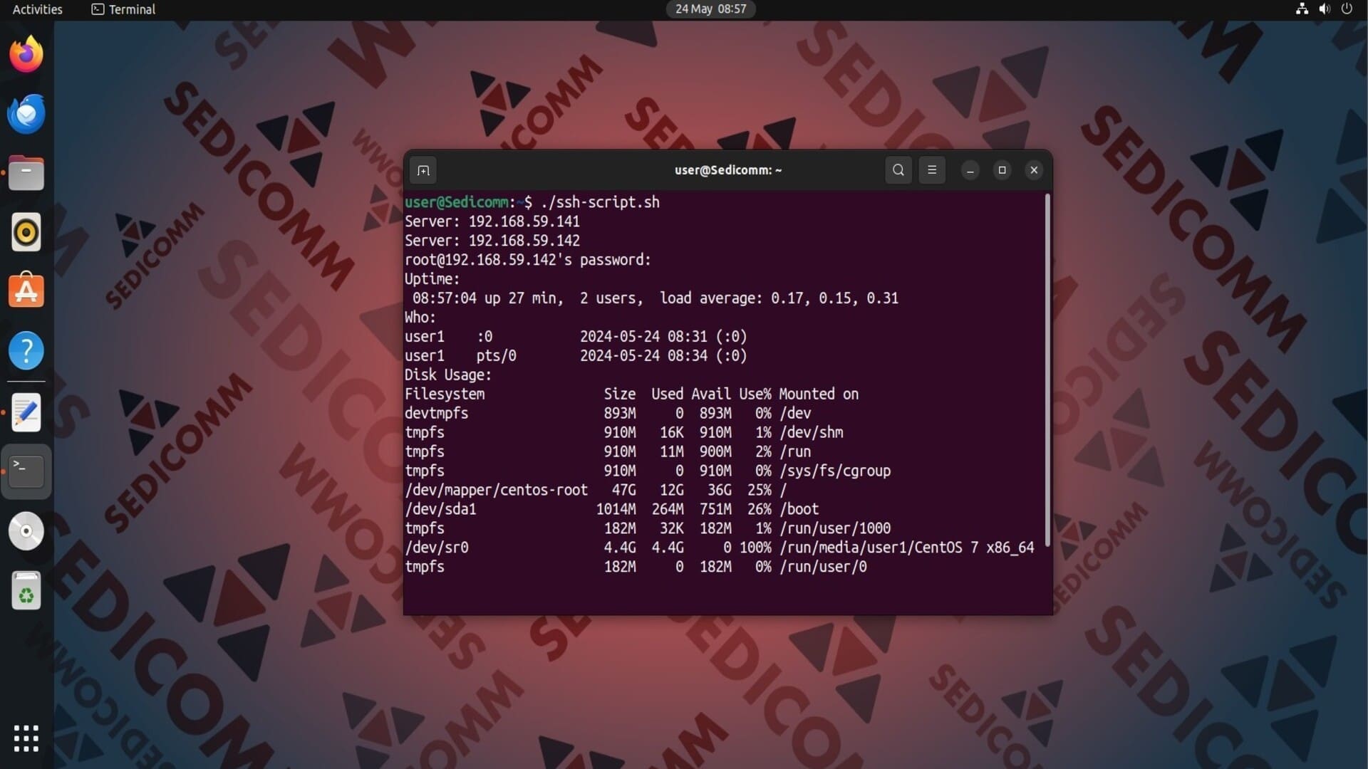 Допустим, нам нужно на двух удаленных компьютерах выполнить команды uptime, who и df -h. Для решения этой задачи можно воспользоваться следующим скриптом: