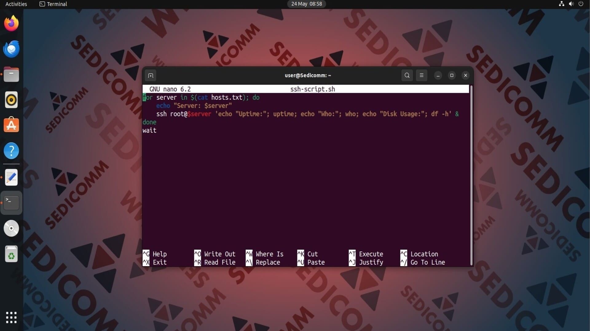 Используя возможности операционной системы Linux, Вы можете дополнительно создать файл, в котором будут содержаться команды, а затем в скрипте считать их для выполнения на удаленных серверах. К примеру, запишем в текстовый документ команды uptime, who и df -h: