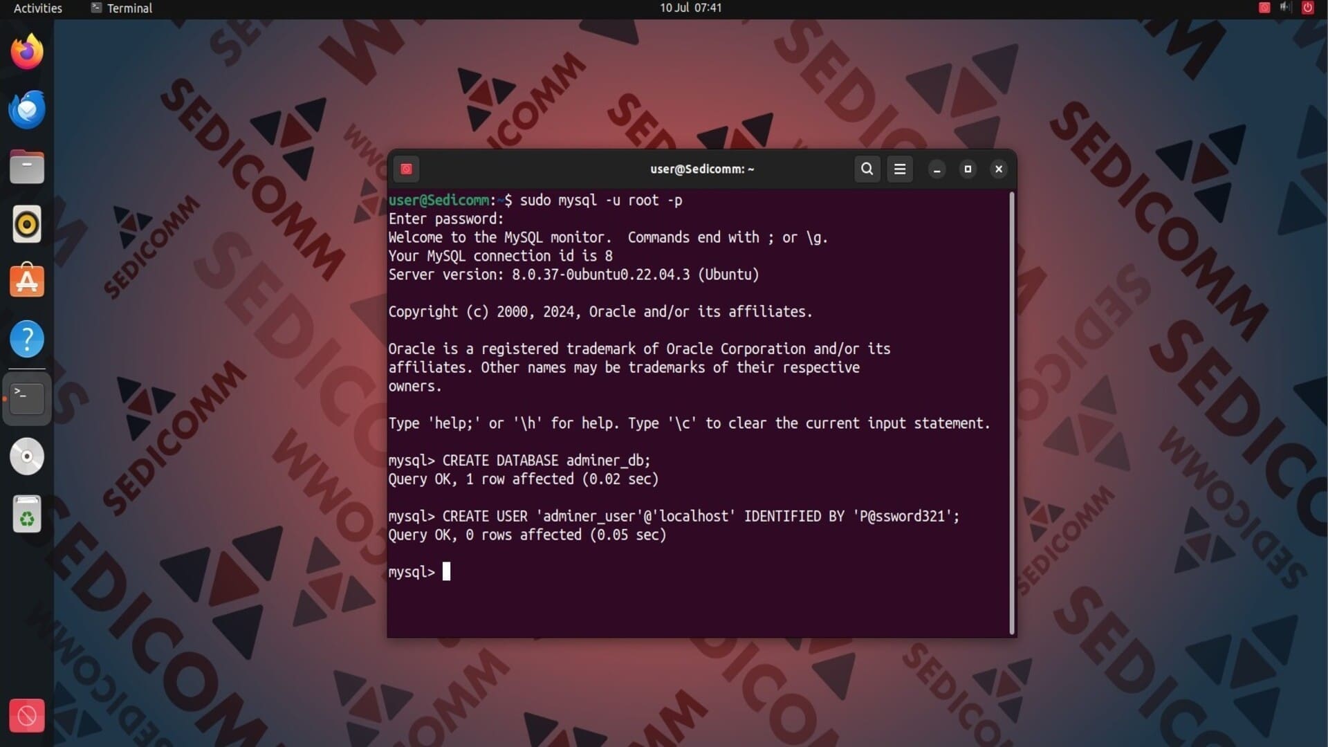 Затем последовательно выполните следующие запросы, чтобы создать базу данных adminer_db и учетную запись adminer_user с паролем P@ssword321: