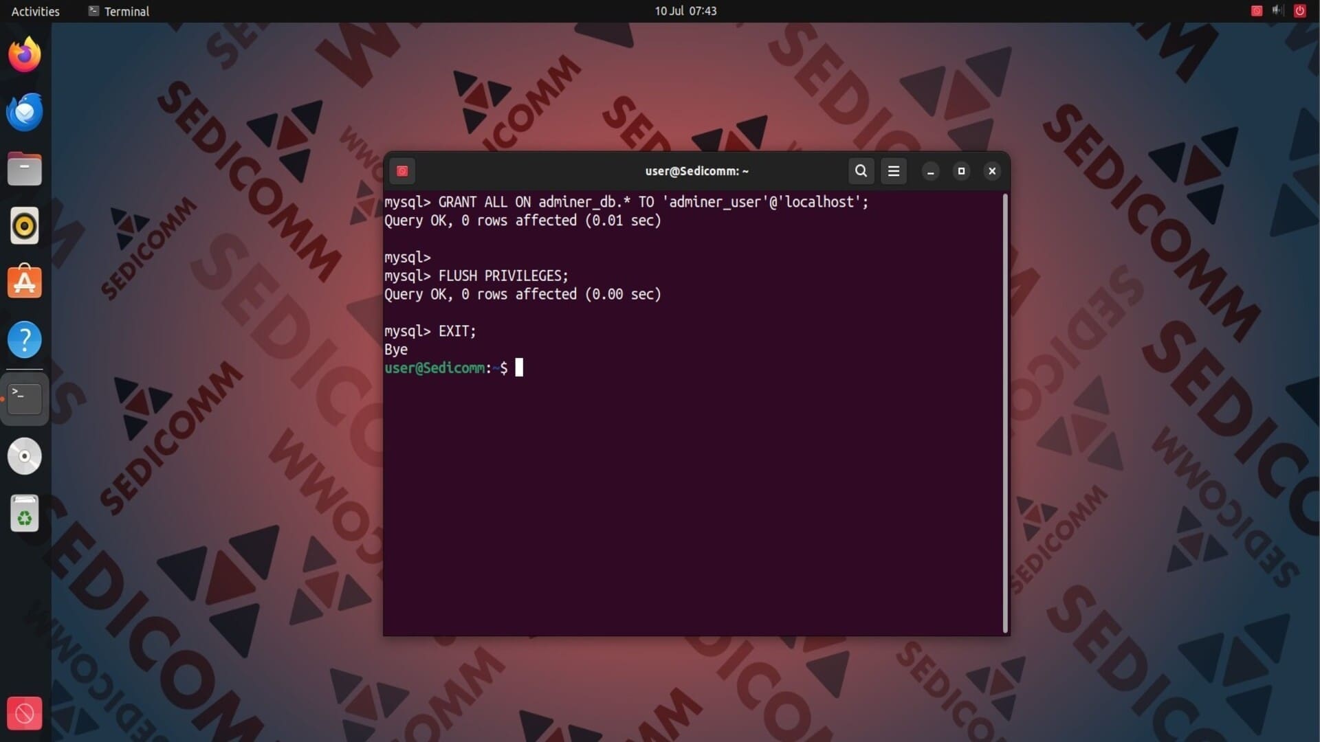 Далее предоставьте пользователю adminer_user все привилегии для базы данных adminer_db и подтвердите внесенные изменения: