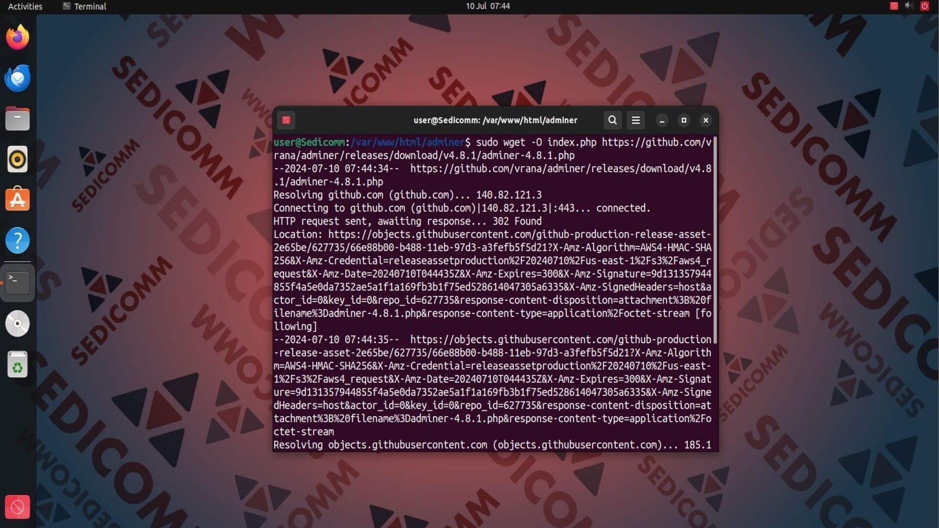 Затем загрузите в созданную папку последнюю версию PHP-файла Adminer с помощью команды wget: