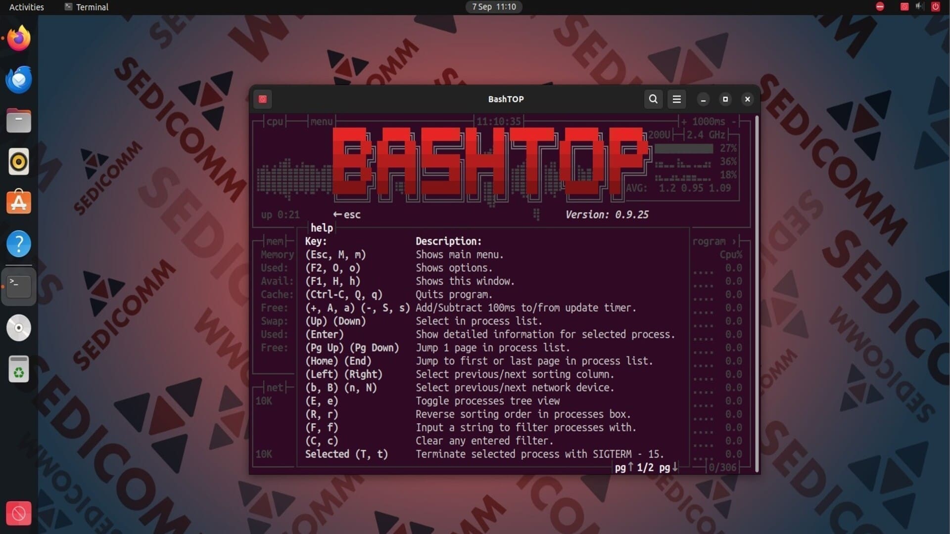 Взаимодействие с интерфейсом Bashtop осуществляется с помощью горячих клавиш. Чтобы вывести их список на экран, нужно открыть меню утилиты с помощью m и выбрать пункт Help.