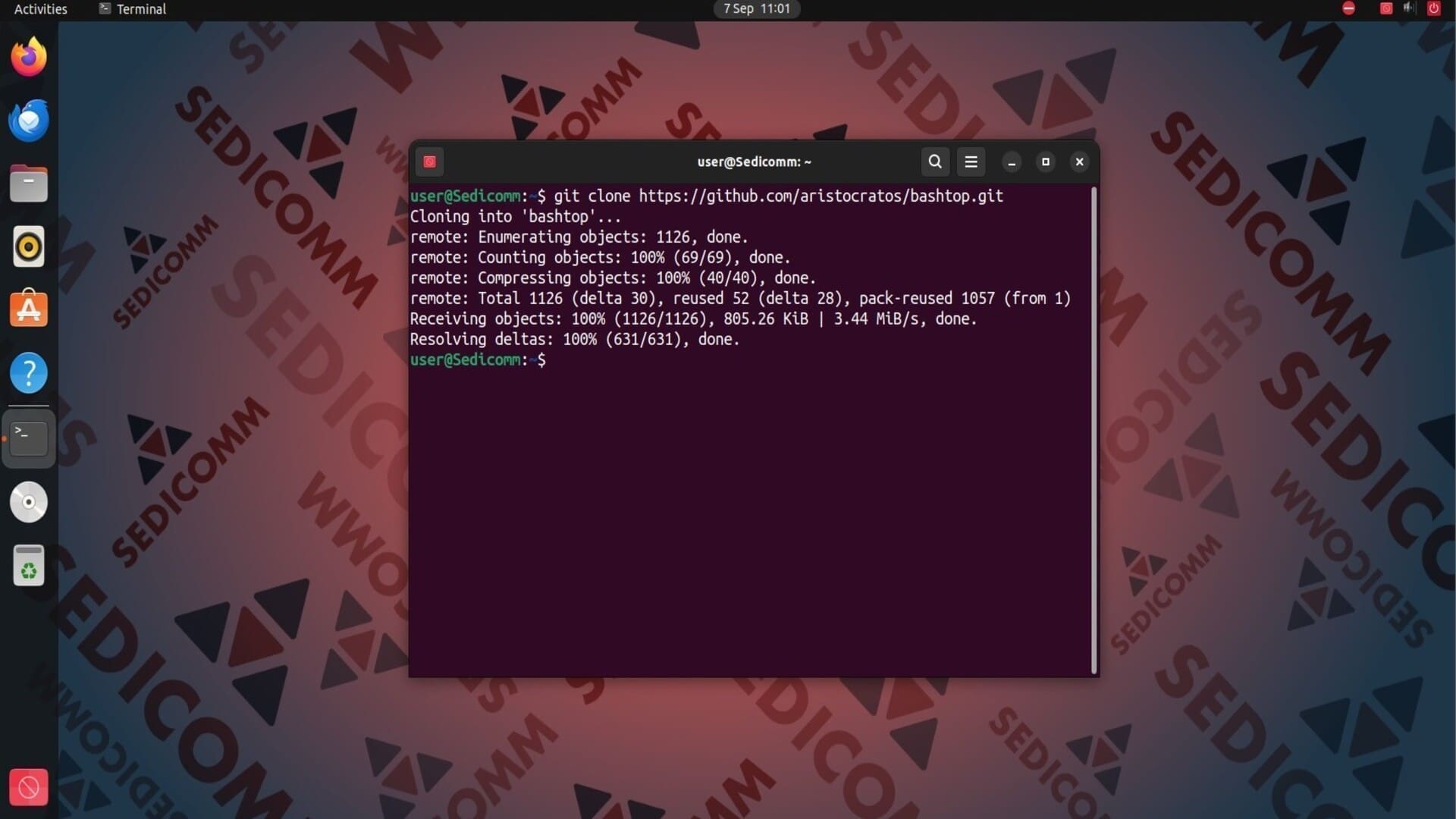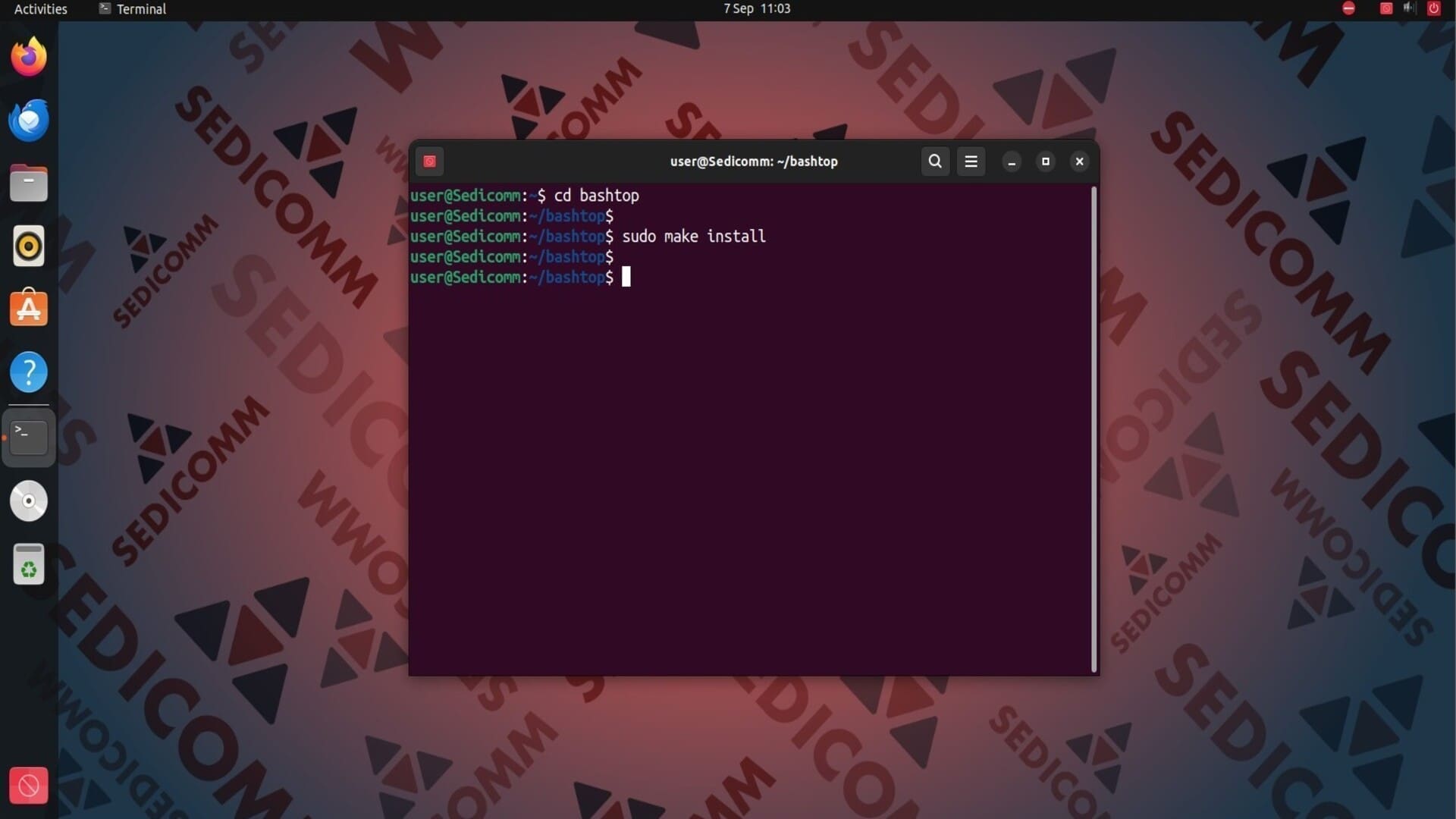 Затем перейти в папку, в которую были клонированы файлы (в нашем случае — это bashtop), и воспользоваться утилитой make для установки Bashtop: