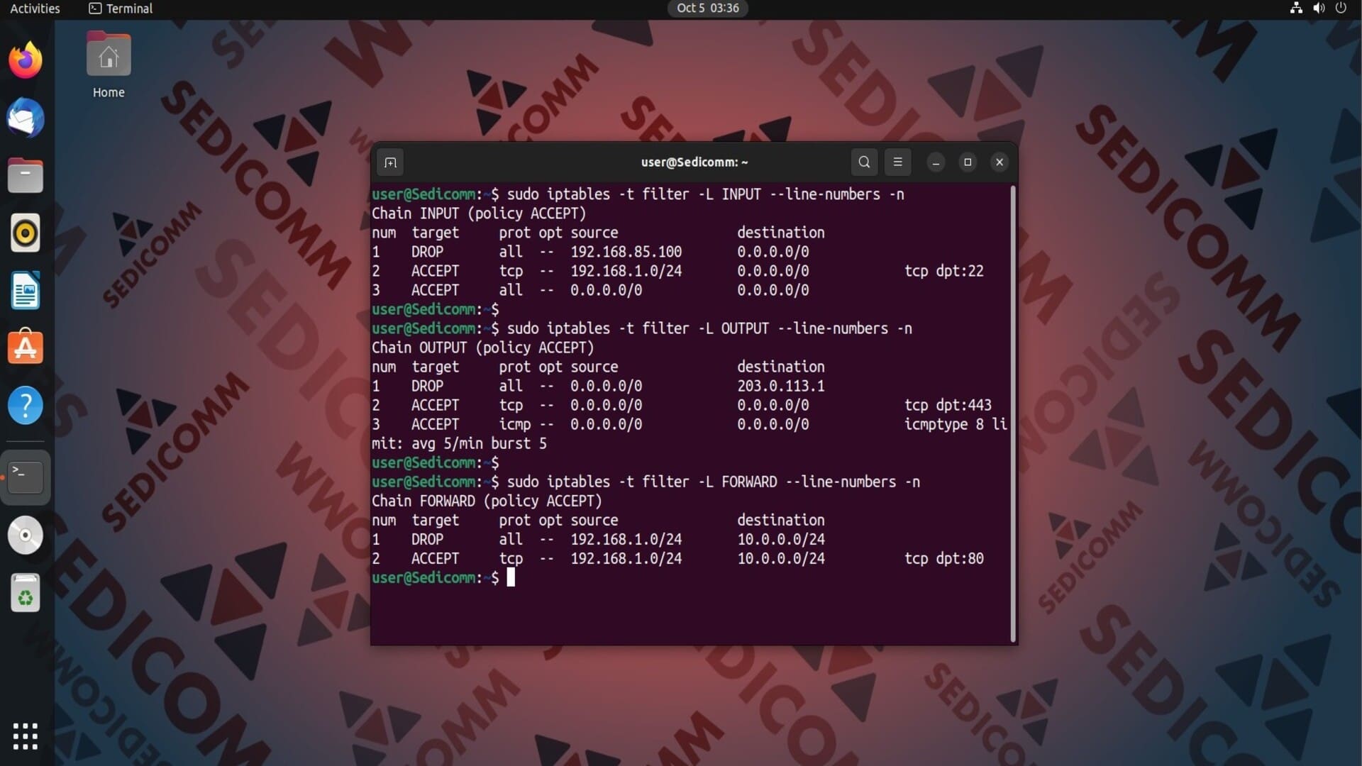 Вы можете использовать следующие команды, чтобы отобразить текущие правила брандмауэра с их порядковыми номерами в цепочках INPUT, OUTPUT и FORWARD:
