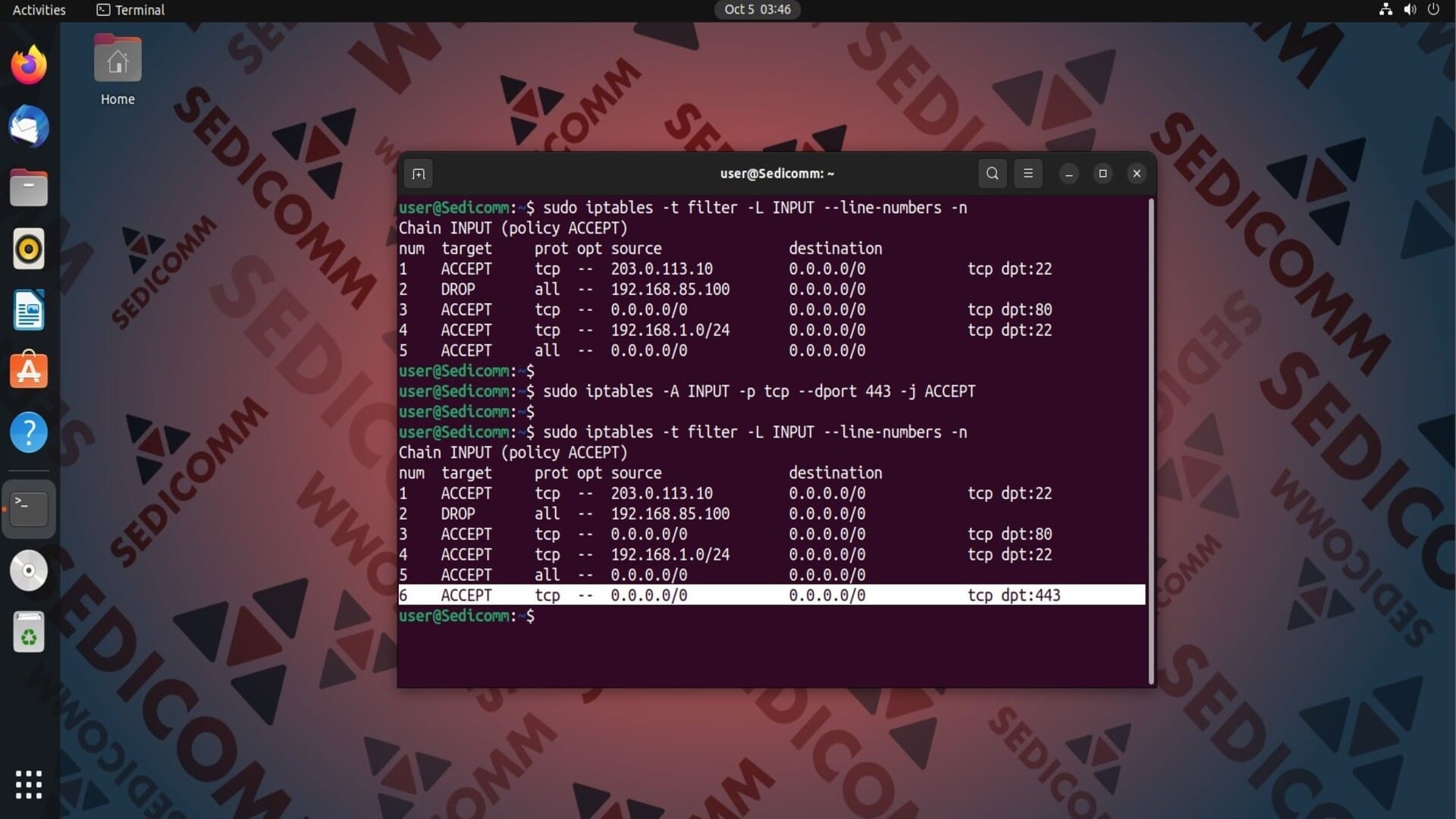 На скриншоте видно, что мы добавили в конец цепочки INPUT шестое правило для контроля сетевого трафика.
