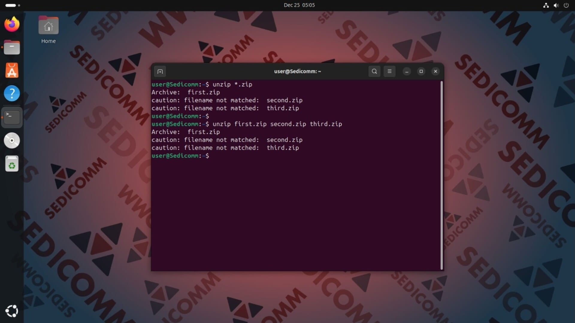На скриншоте выше видно, что попытка распаковать архивы таким способом завершилась неудачей. Аналогично, не удалось извлечь файлы, даже когда названия архивов были перечислены в аргументах команды unzip: