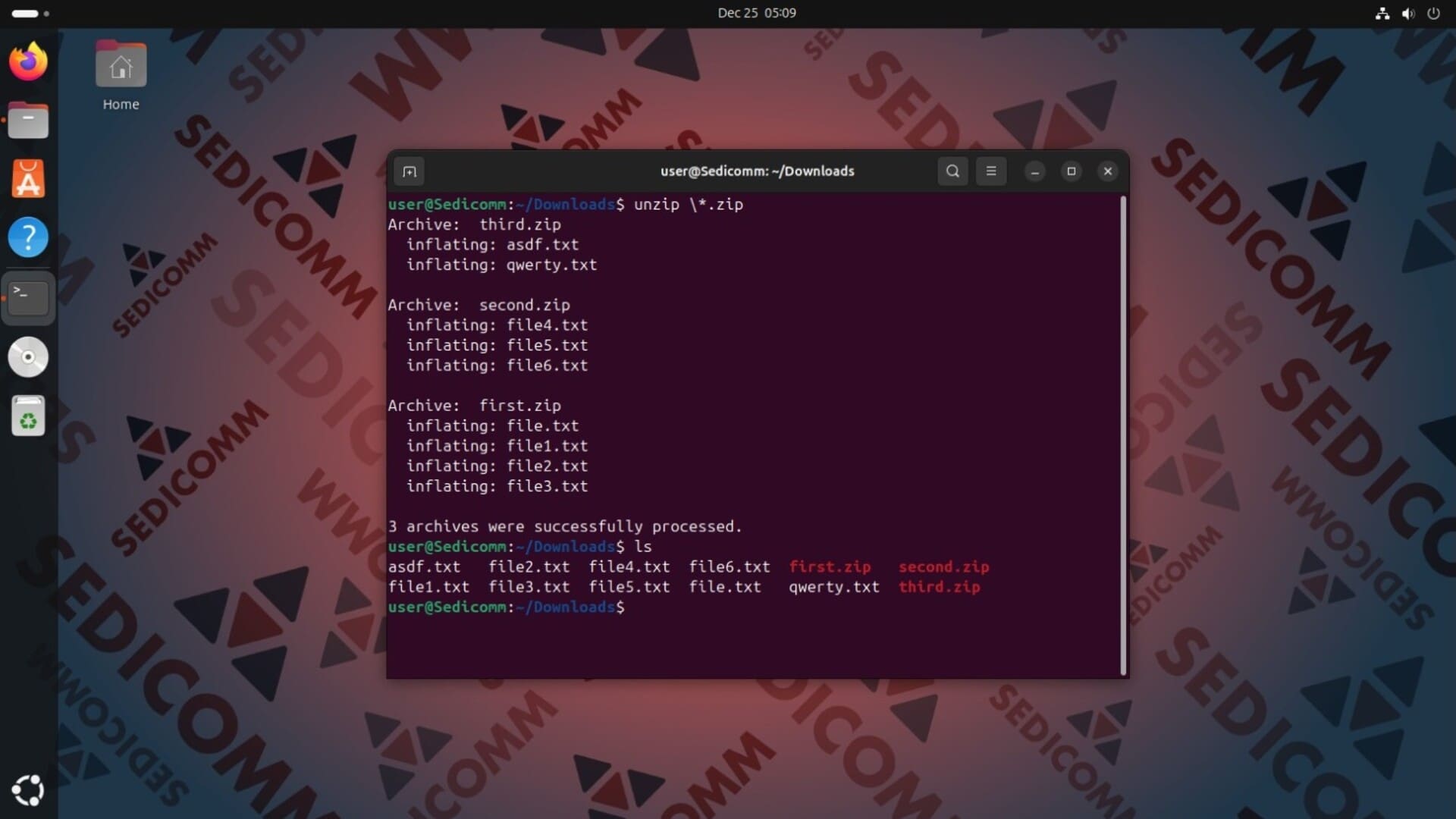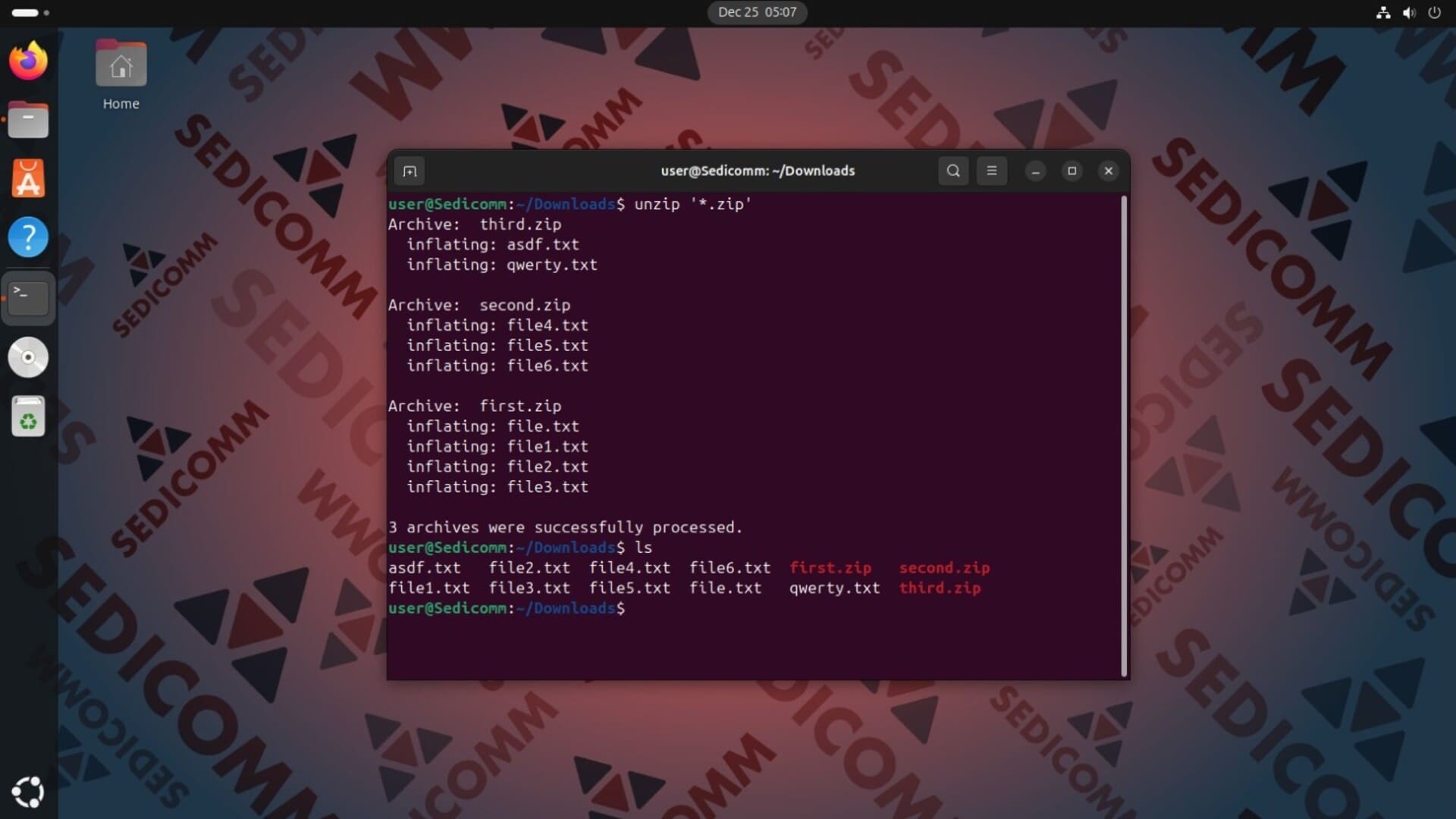 Мы также можем использовать цикл for для извлечения всех архивов ZIP в текущей директории. Для этого применим следующую команду: