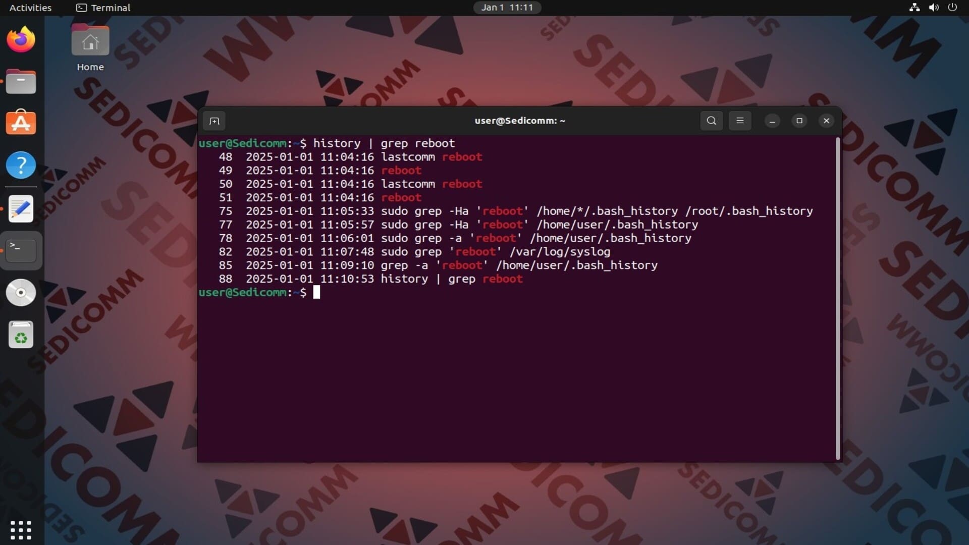 Чтобы вывести на экран историю применения команды reboot (отвечающую за перезагрузку ОС), выполните в терминале: