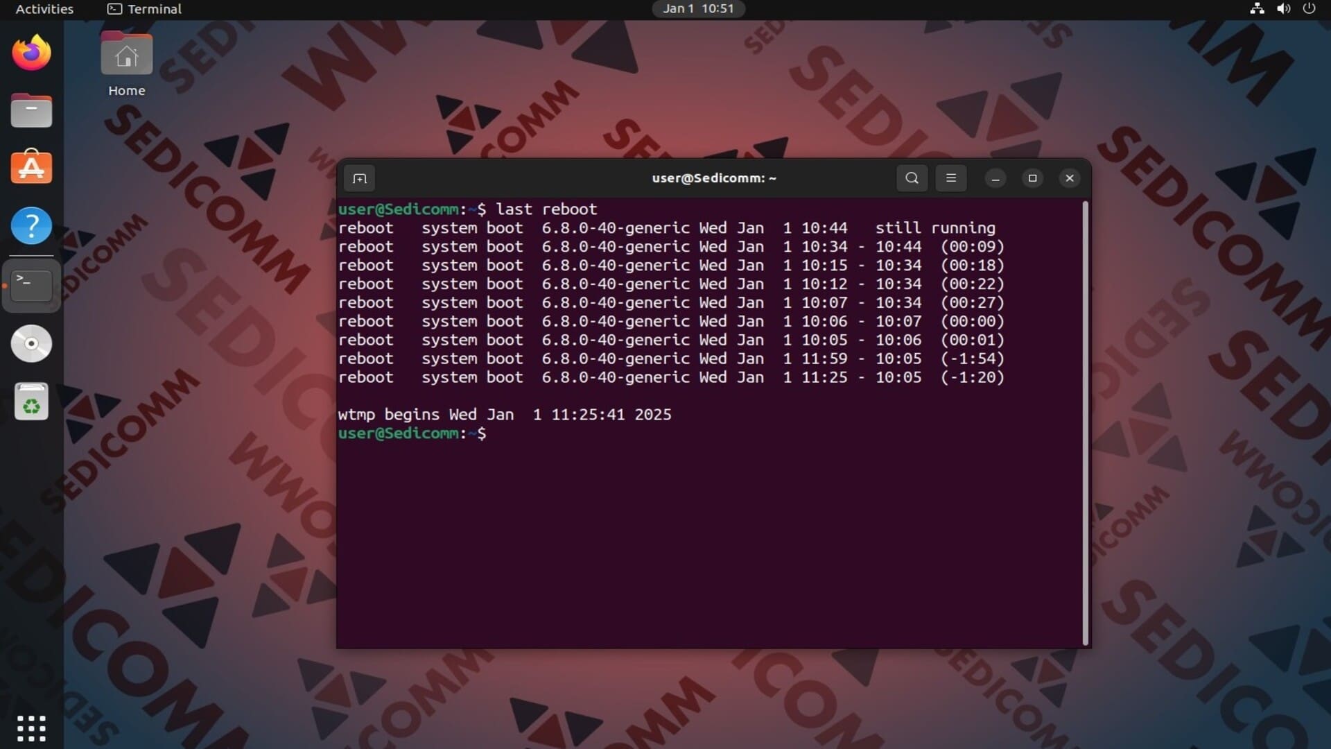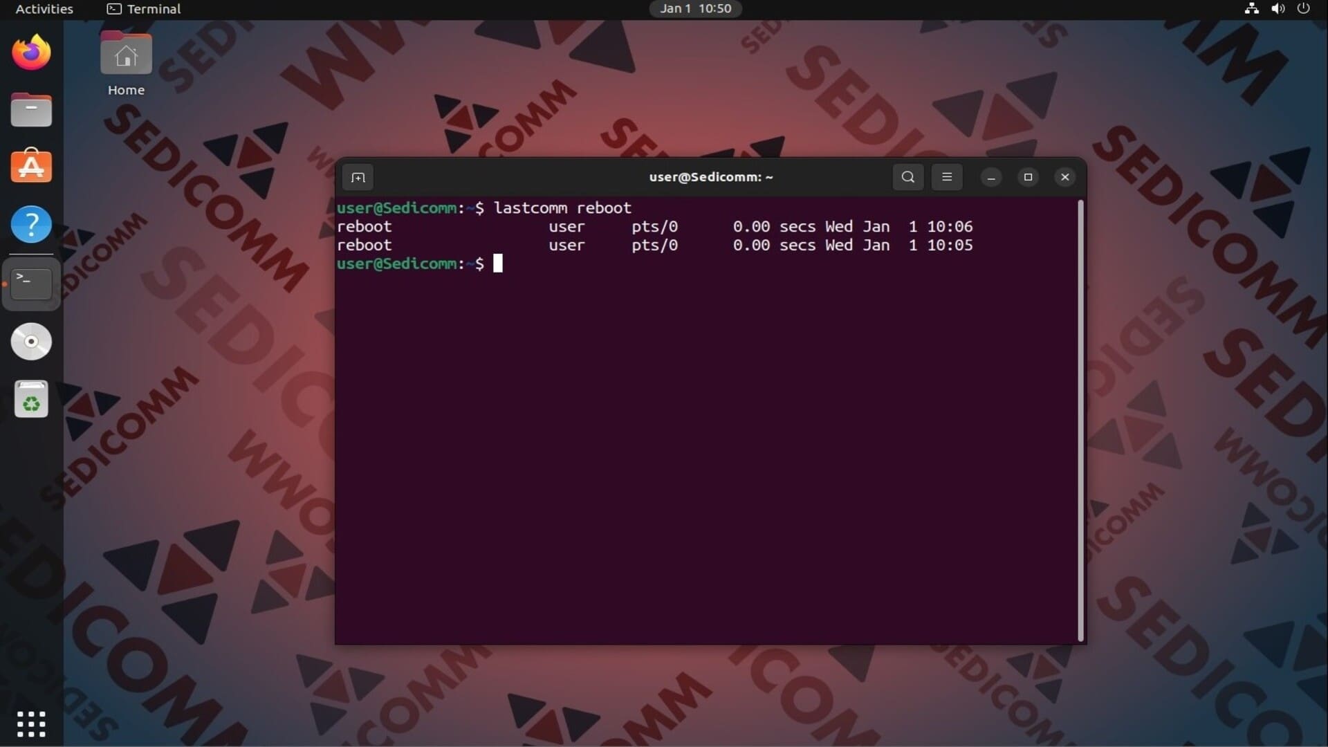 Также из набора команд psacct Вы можете использовать утилиту last, чтобы вывести в окно терминала полную историю перезагрузок компьютера. Например: